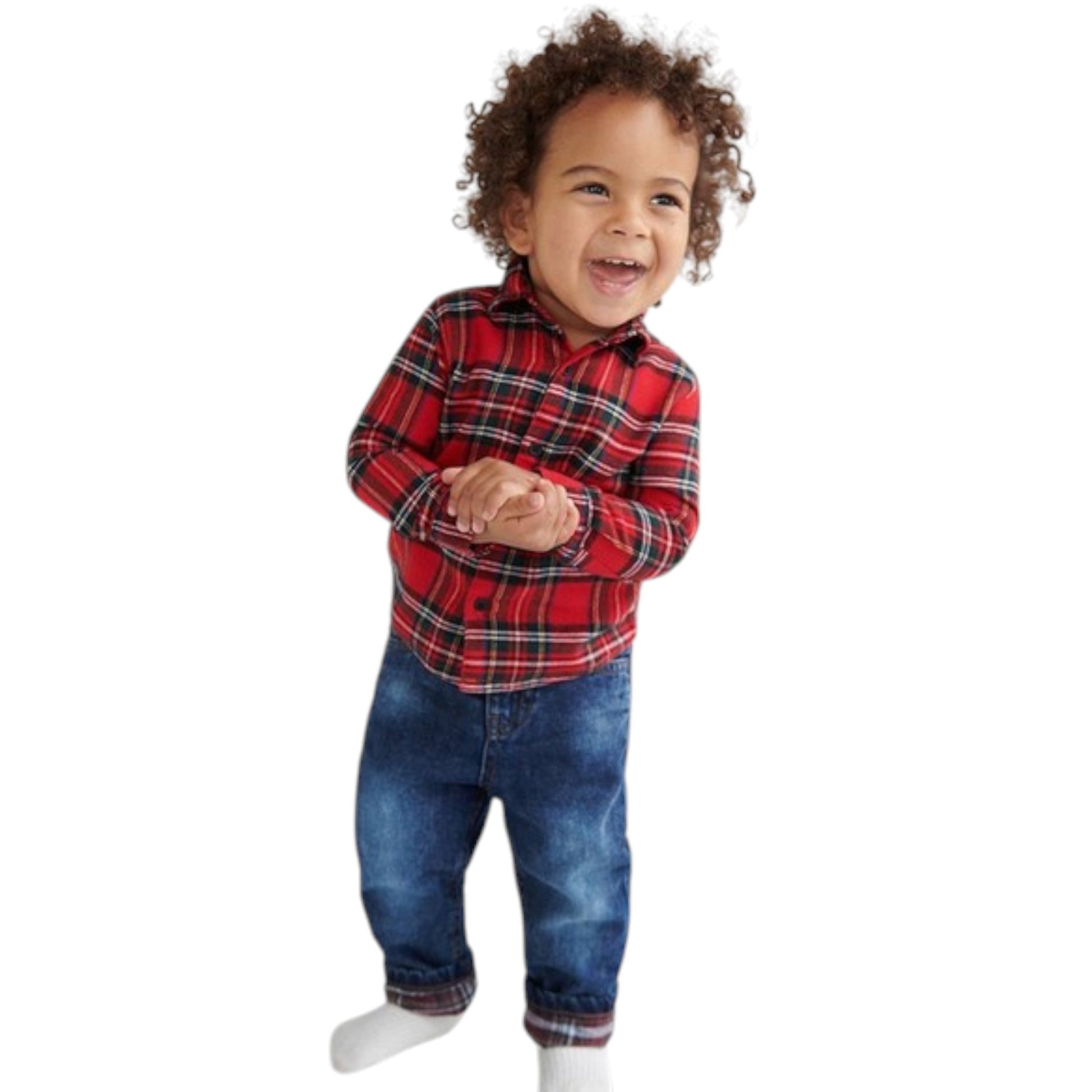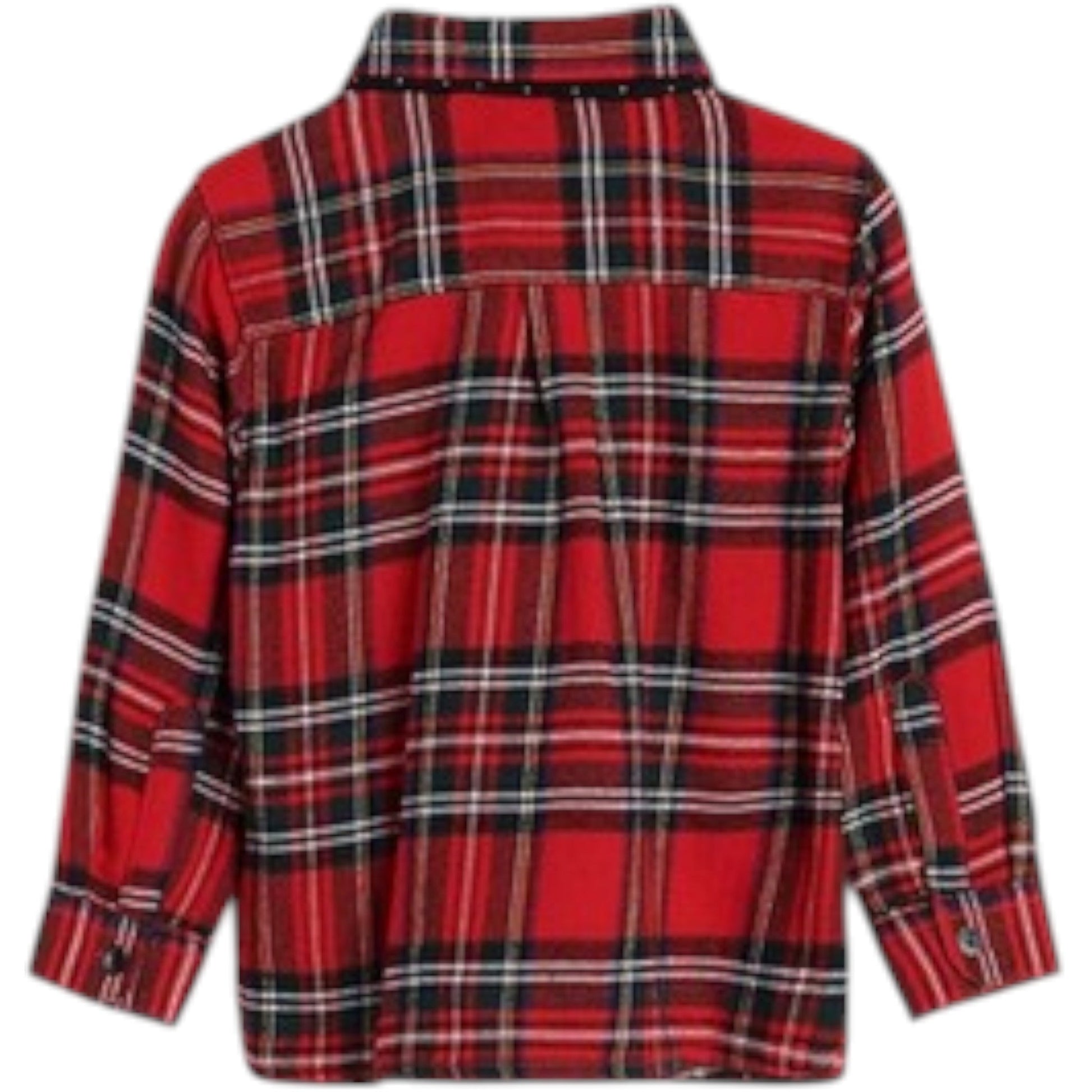 Címke nélküli, piros, fekete, sárga és fehér színeket tartalmazó kockás minta, galléros, gombos, hosszú ujjú, flanel hatású