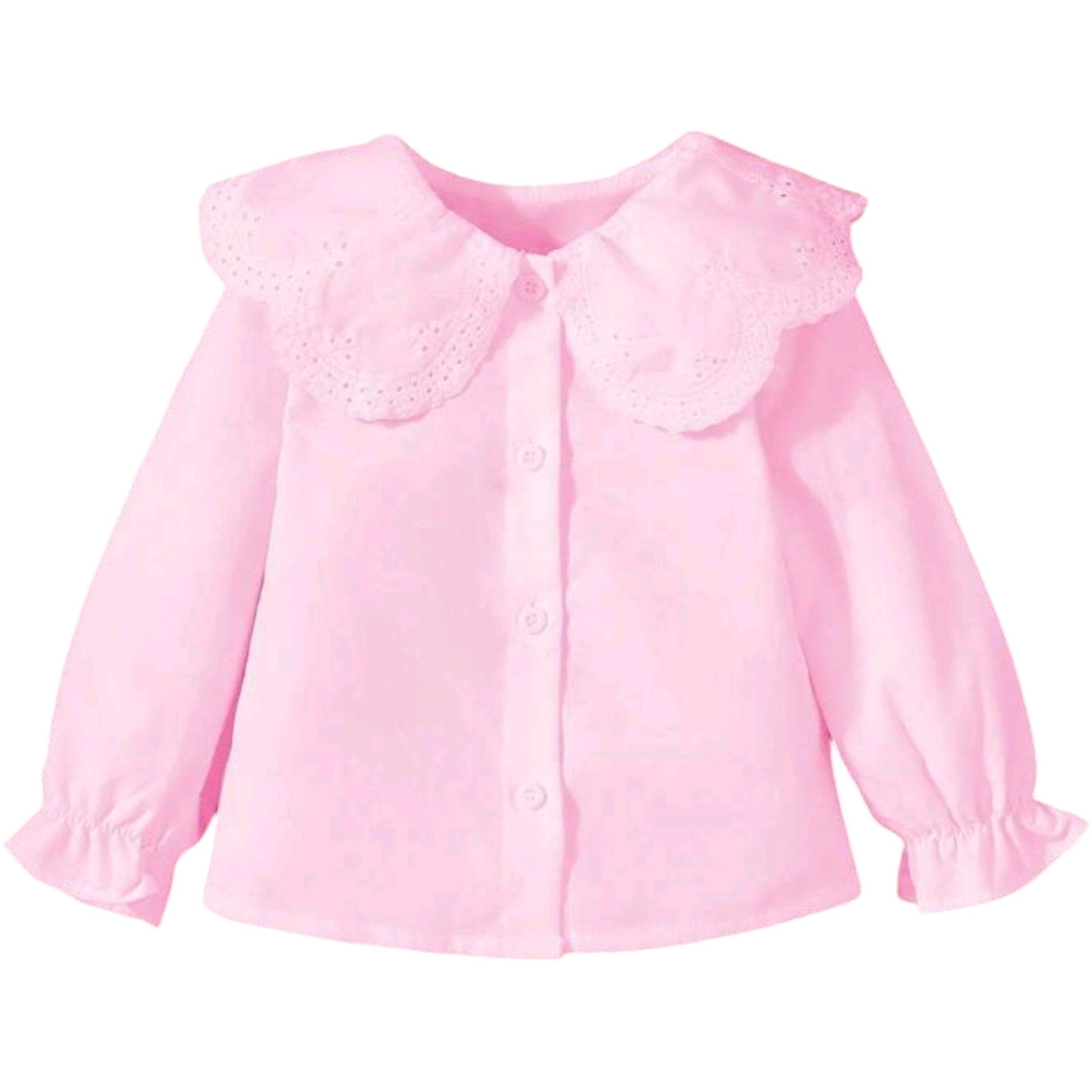Címke nélküli, rózsaszín, hosszú ujjú blúz, fodros ujjvégekkel, kerek, hímzett/perforált szélű gallérral, elől gombokkal záródó.