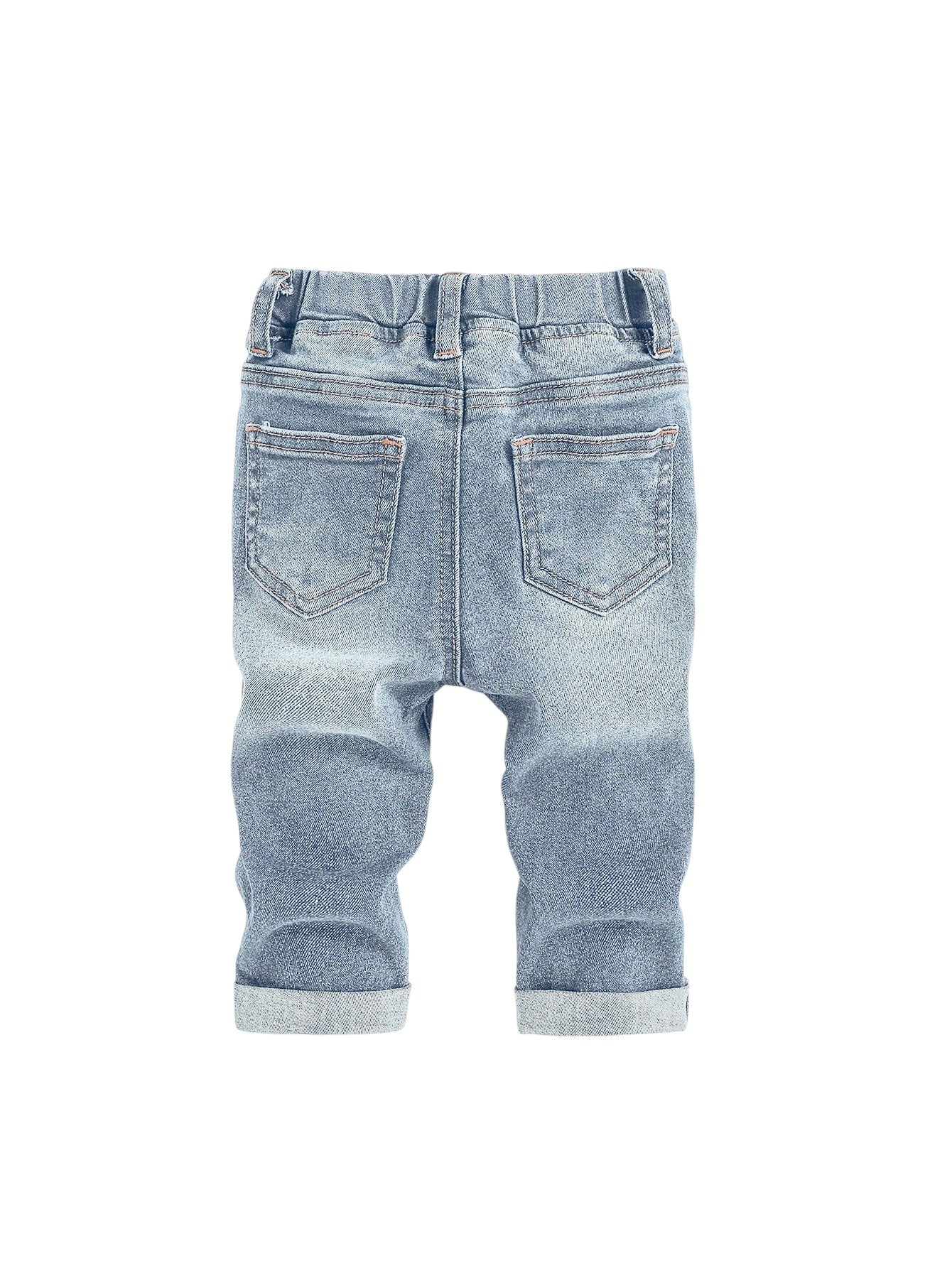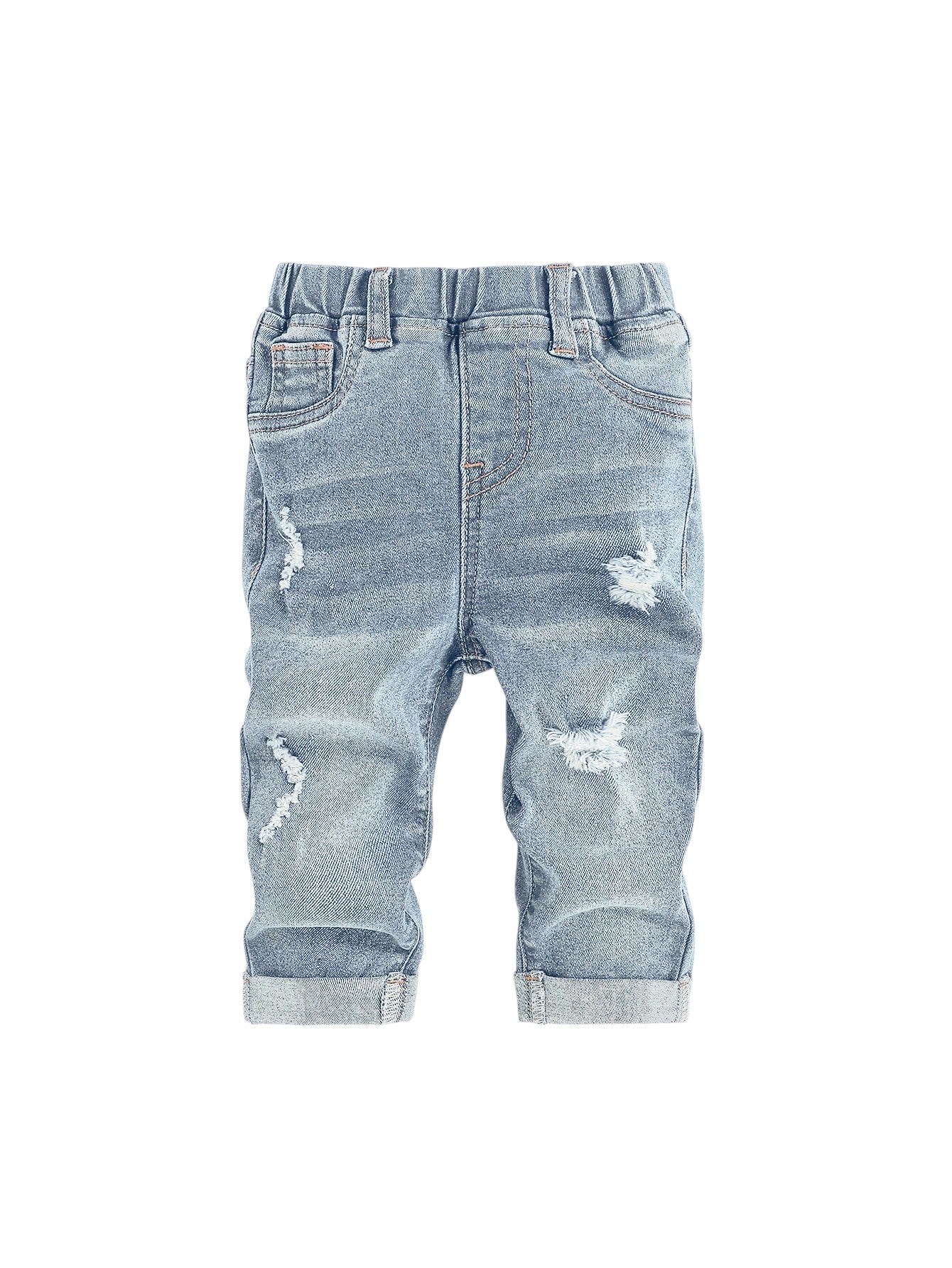 Címke nélküli, világoskék, gumis derekú, szaggatott farmer