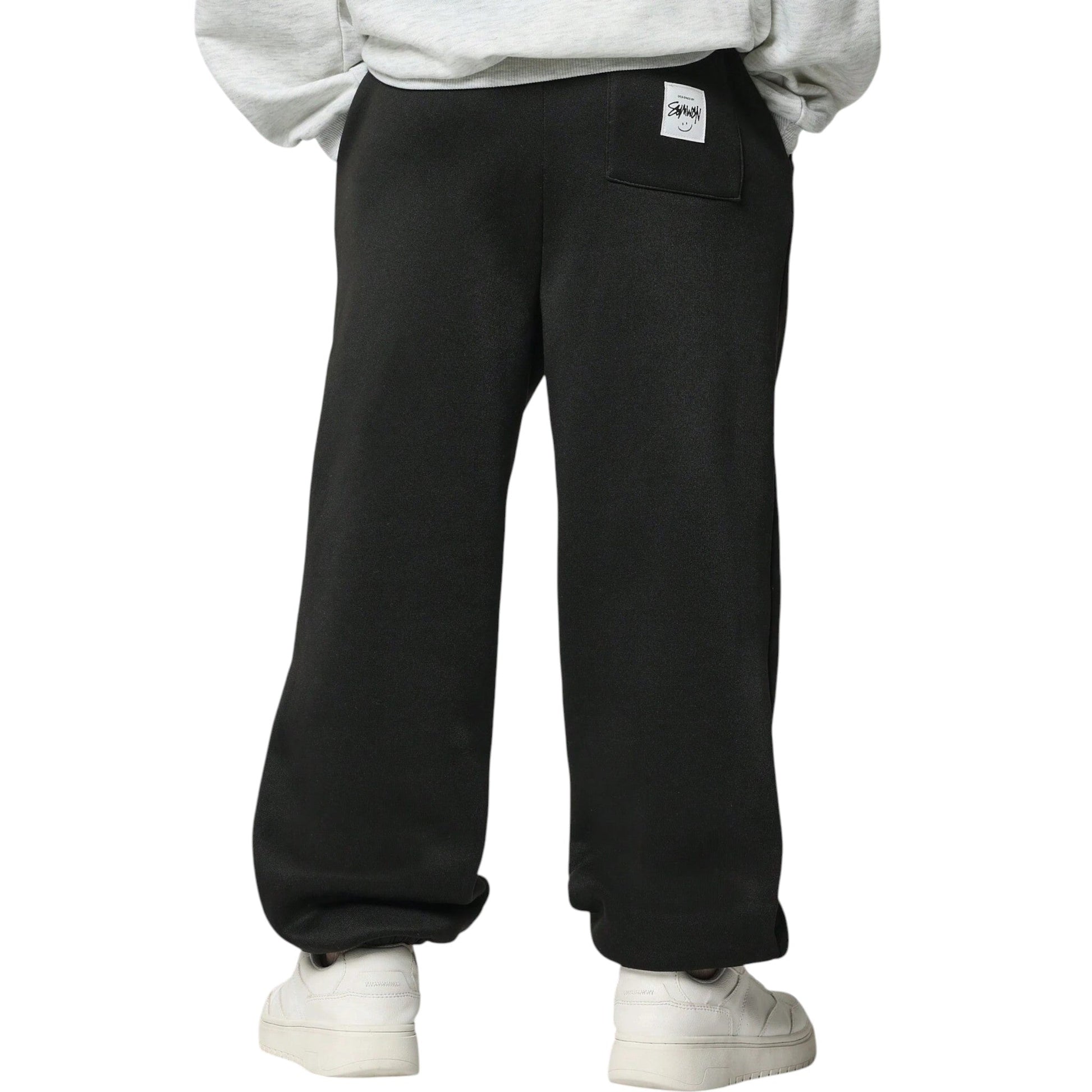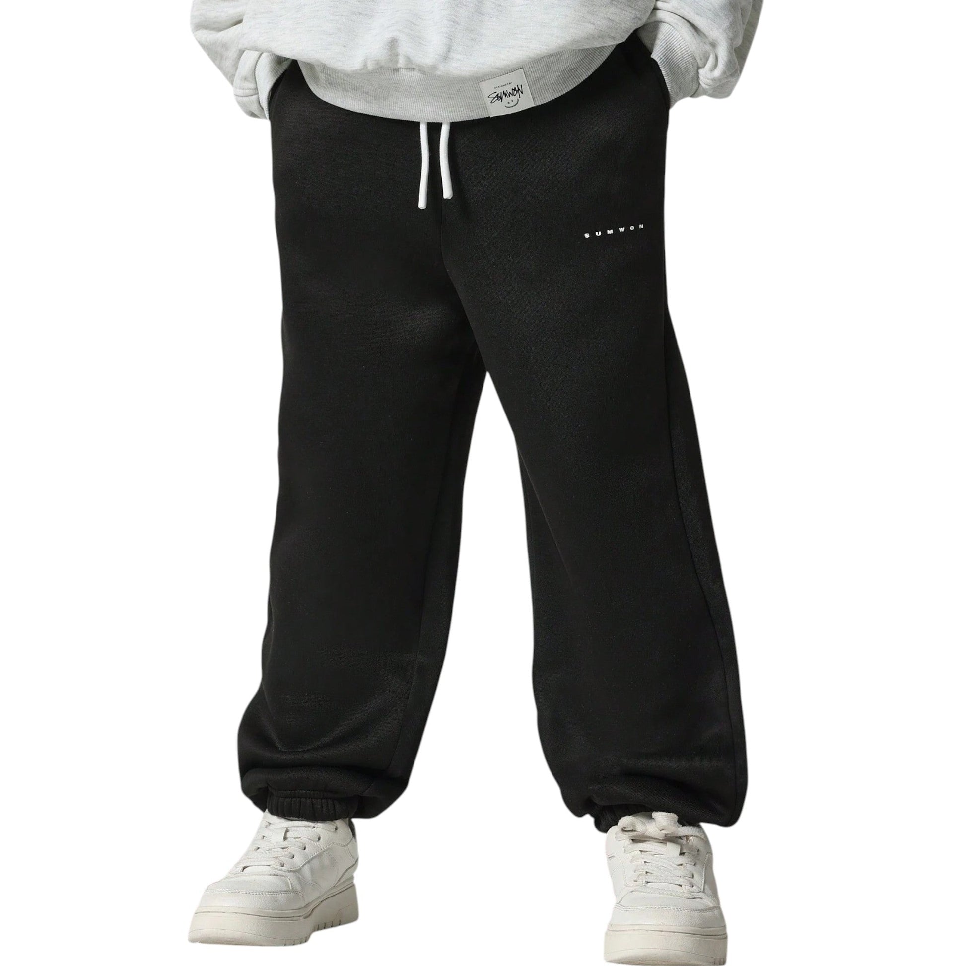 Címke nélküli, fekete, logóval díszített, laza szabású szabadidő nadrág, húzózsinórral.