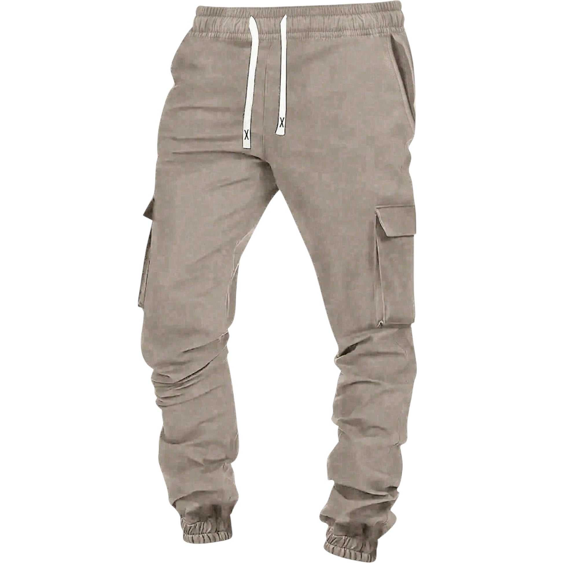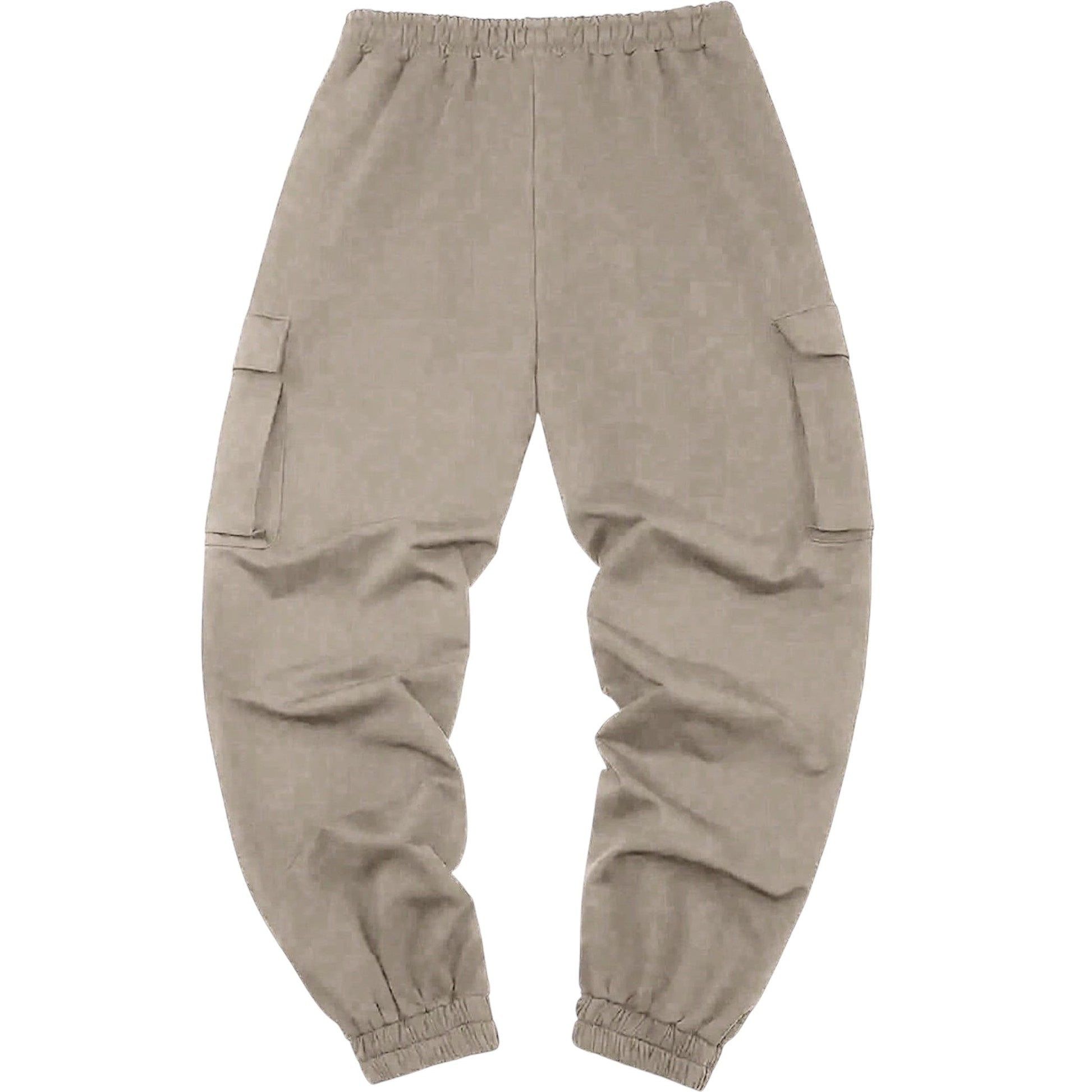 Címke nélküli, taupe, laza szabású, cargo zsebes jogger nadrág, húzózsinóros derékrésszel és gumis bokával.