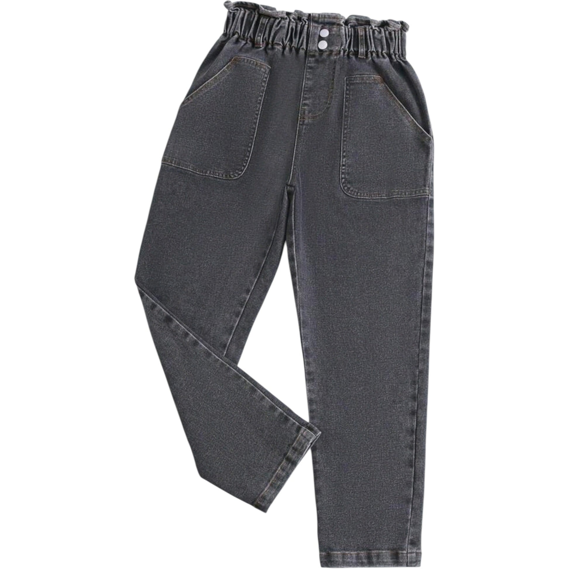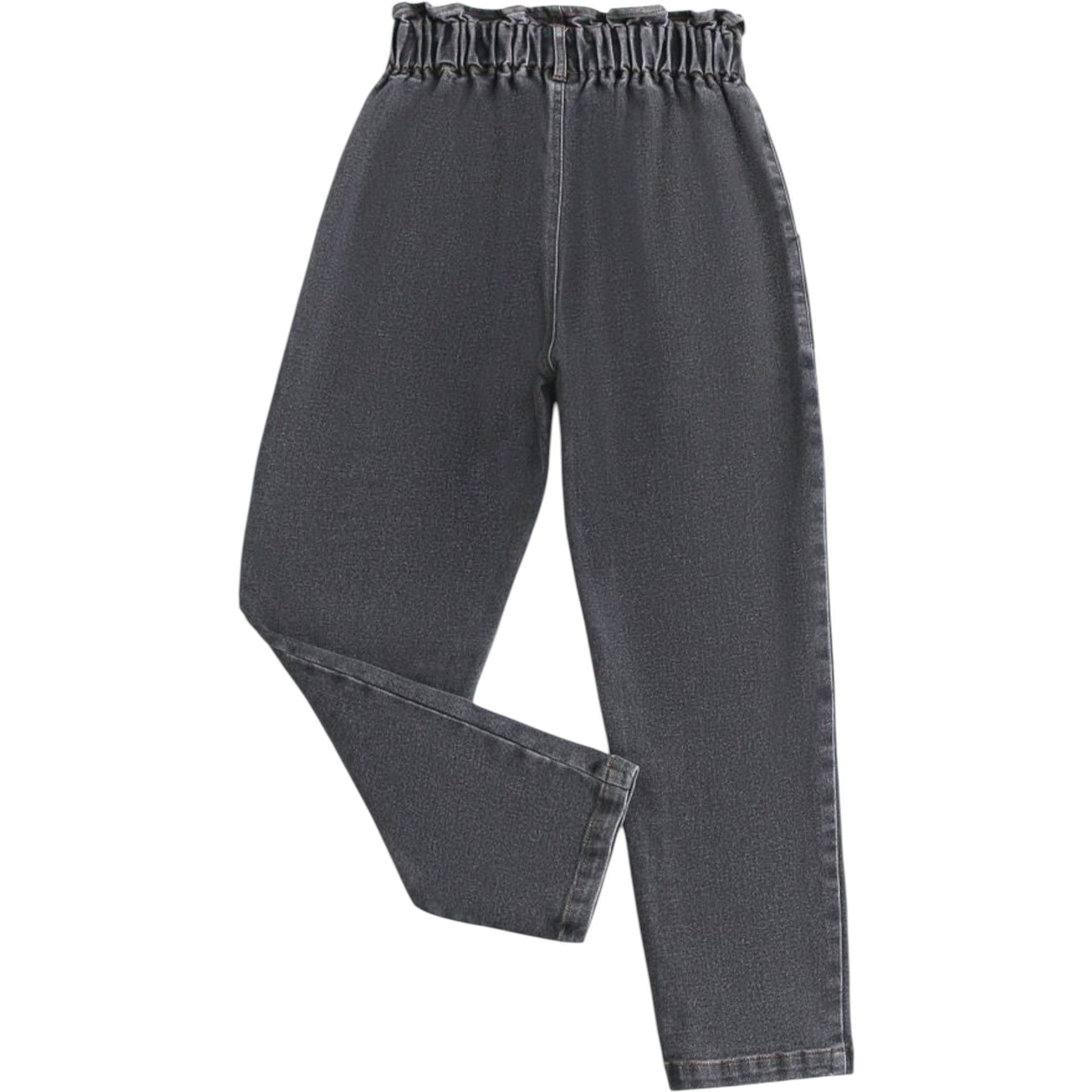 Címke nélküli, sötétszürke, magas paperbag (ráncolt) derekú farmer nadrág, elöl nagy, rávarrt zsebekkel, elöl gombos záródással, egyenes, enyhén szűkülő szárral.
