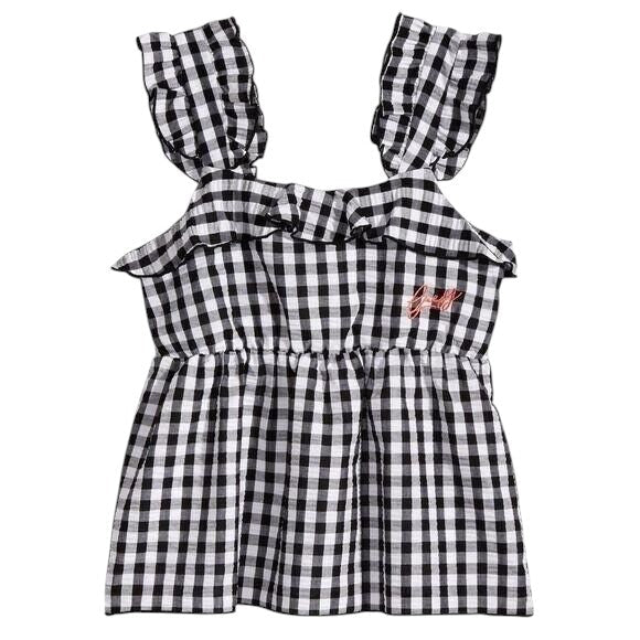Címke nélküli, fekete és fehér, szövött pamut, fodros ujjú felső fazon, gingham kockás minta, fodros vállpántok, gumis derék.