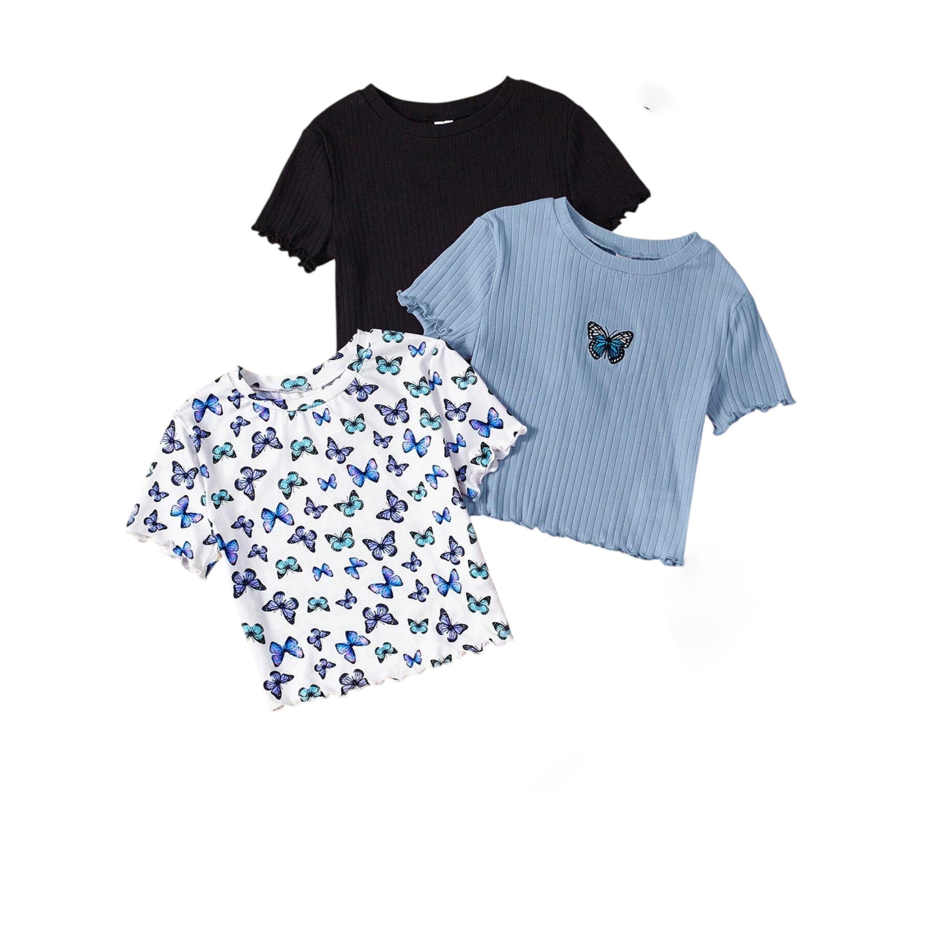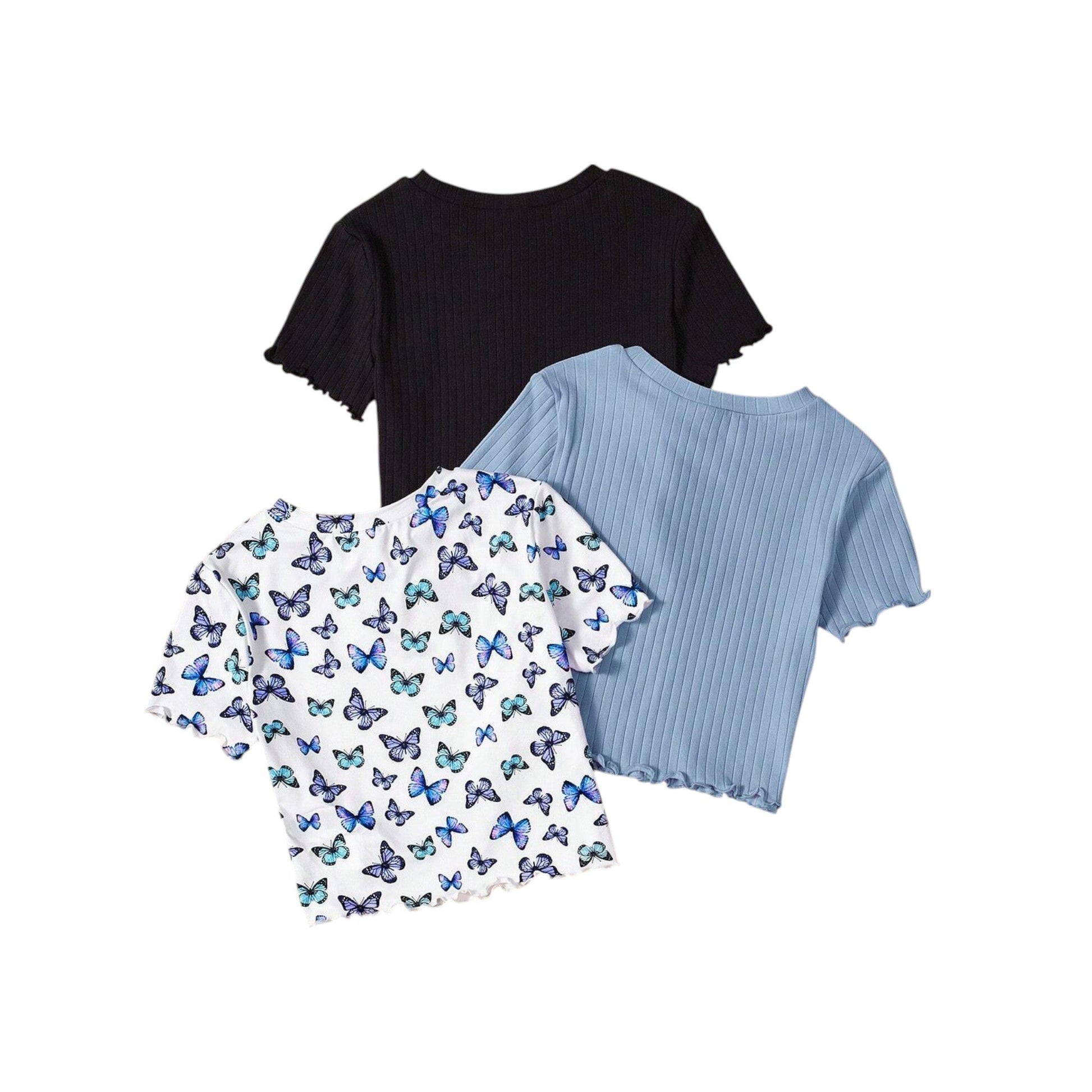 Címke nélküli, fekete, kék és pillangó mintás fehér, rövid ujjú, fodros szélű, bordázott póló.