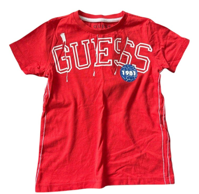 Címke nélküli, piros, pamutdzsörzé, póló fazon, rövid ujjak, kerek nyak, fehér "GUESS 1981" kollégiumi stílusú logó.