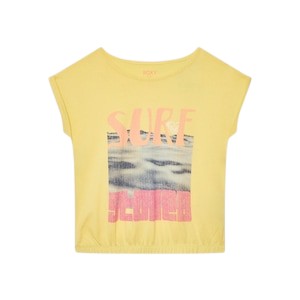 Címke nélküli, sárga, szintetikus, póló, kerek nyakkivágás, rövid ujj, gumi alj, surf mintás.