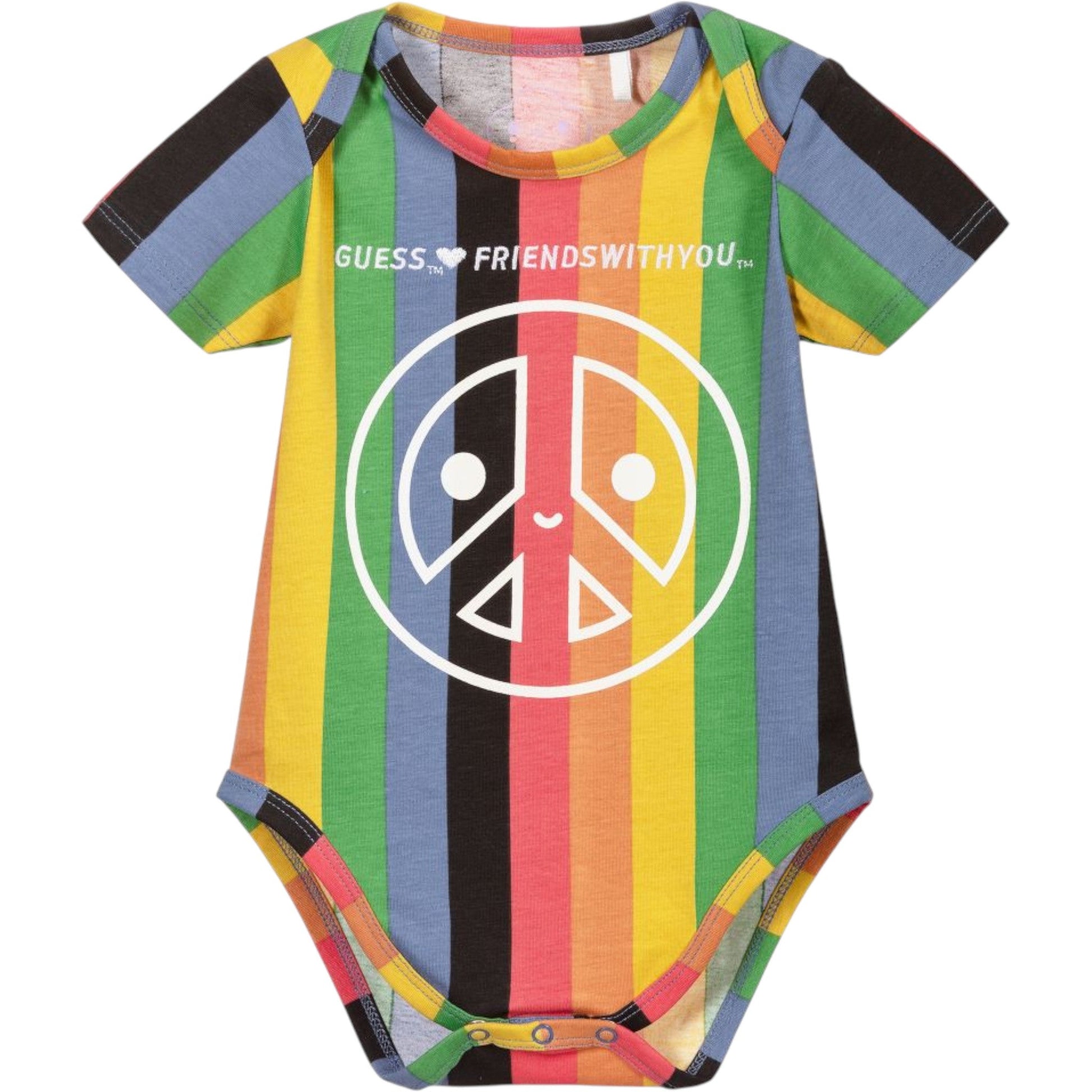 Címke nélküli, sokszínű (szivárvány csíkos), rövid ujjú body, elöl nagyméretű békejel/mosolygó arc grafikával és Guess logóval.