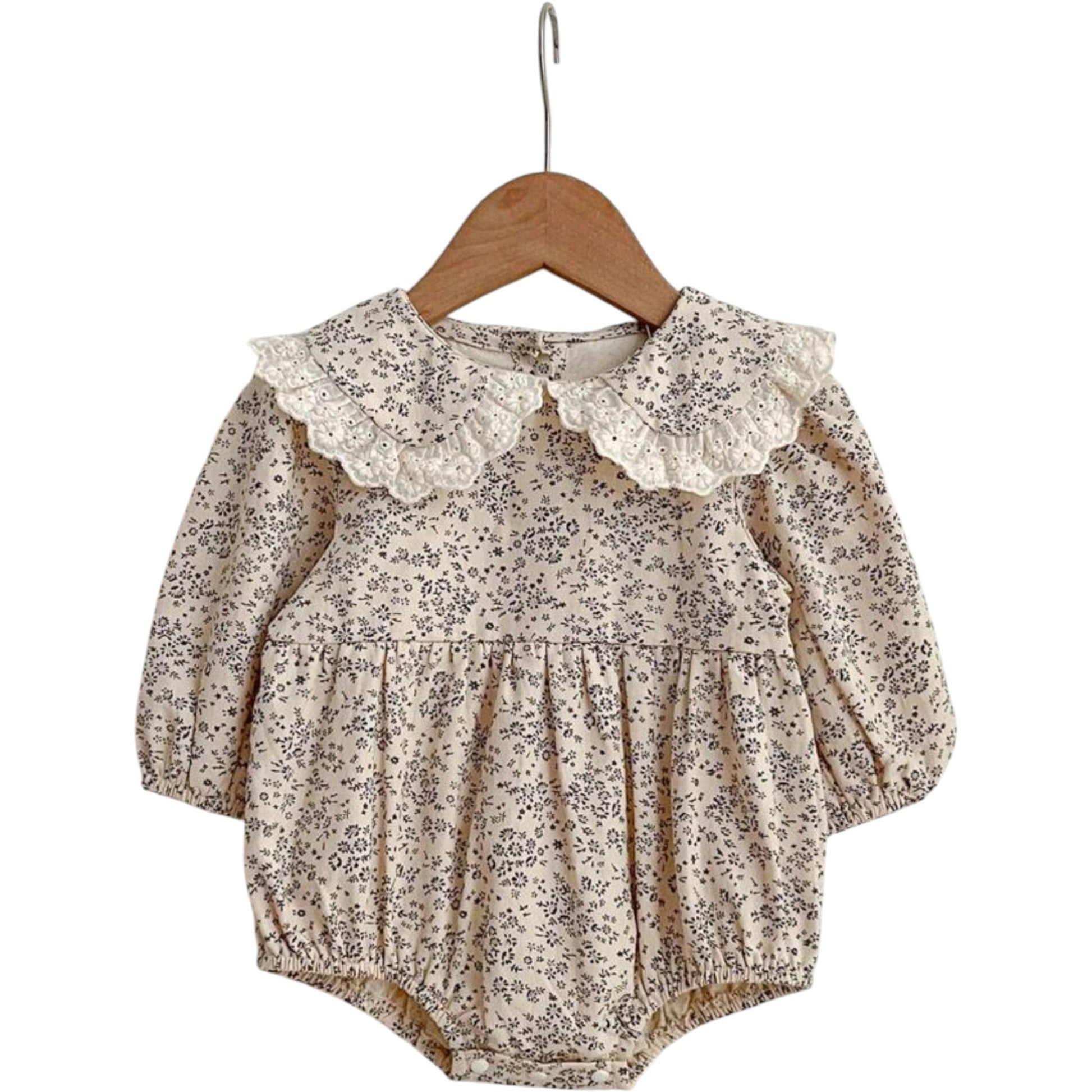 Címke nélküli, bézs/krém, hosszú ujjú, fekete apró virágmintás body, fodros szélű hímzett gallérral, elől gombokkal és mellrészen ráncolt díszítéssel.