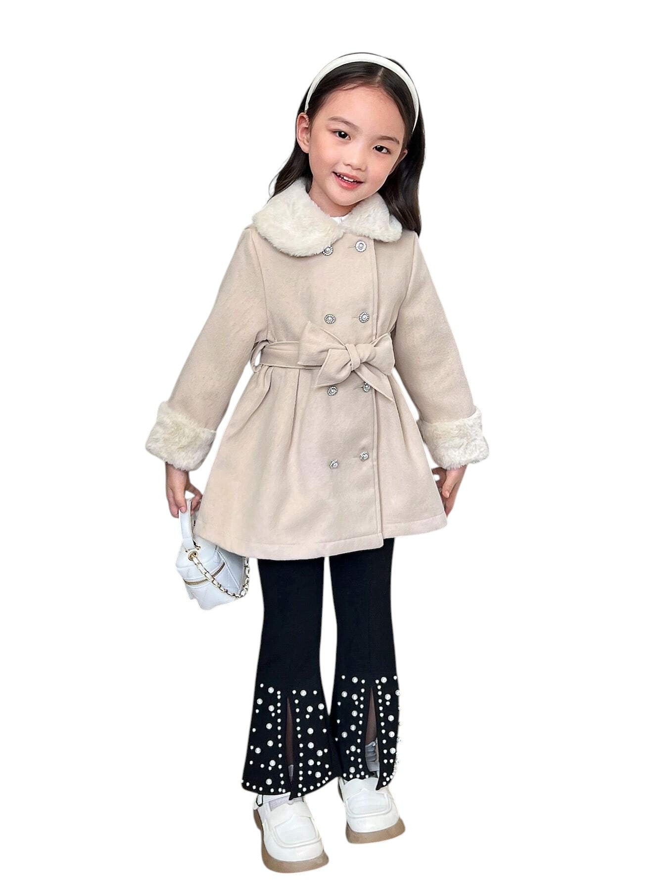 Címke nélküli, bézs, dupla gombsoros, öves, műszőrme galléros és mandzsettás gyapjúkabát fekete-fehér pöttyös nadrággal kislánynak