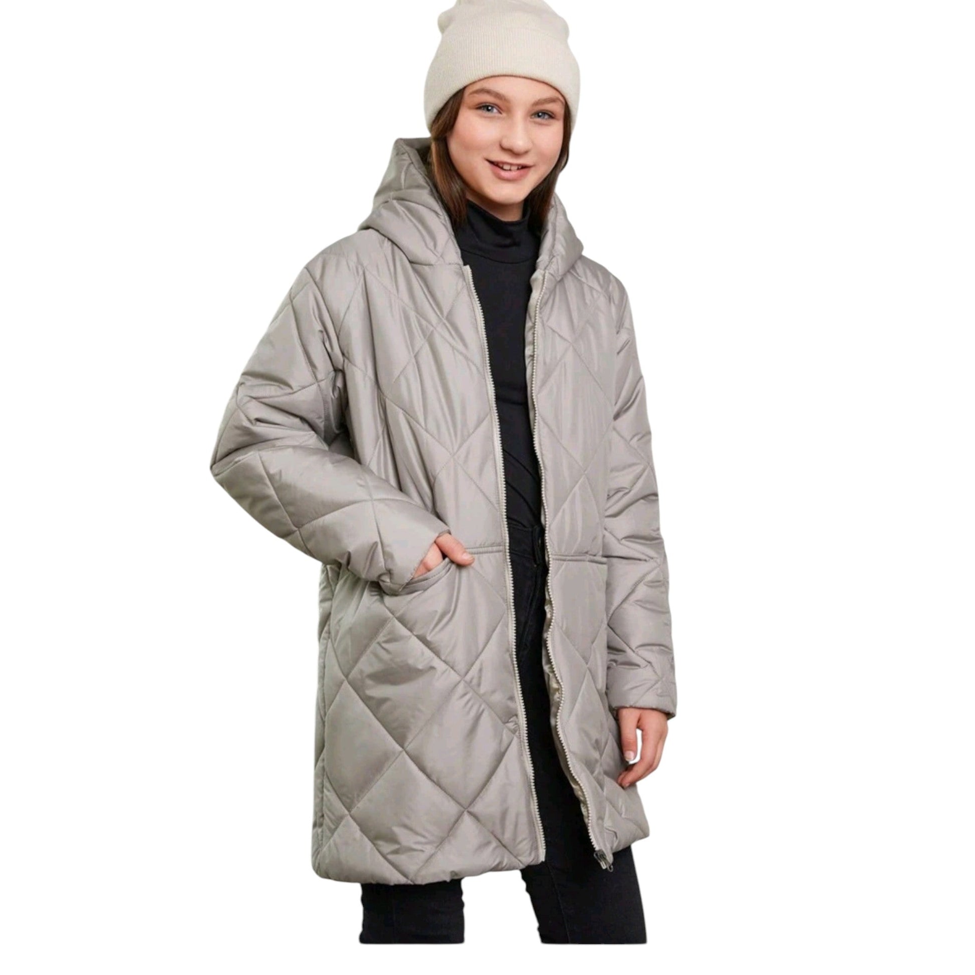 Címke nélküli, szürke, hosszú, rombusz mintás steppelt kabát, kapucnival, elöl cipzárral záródik.