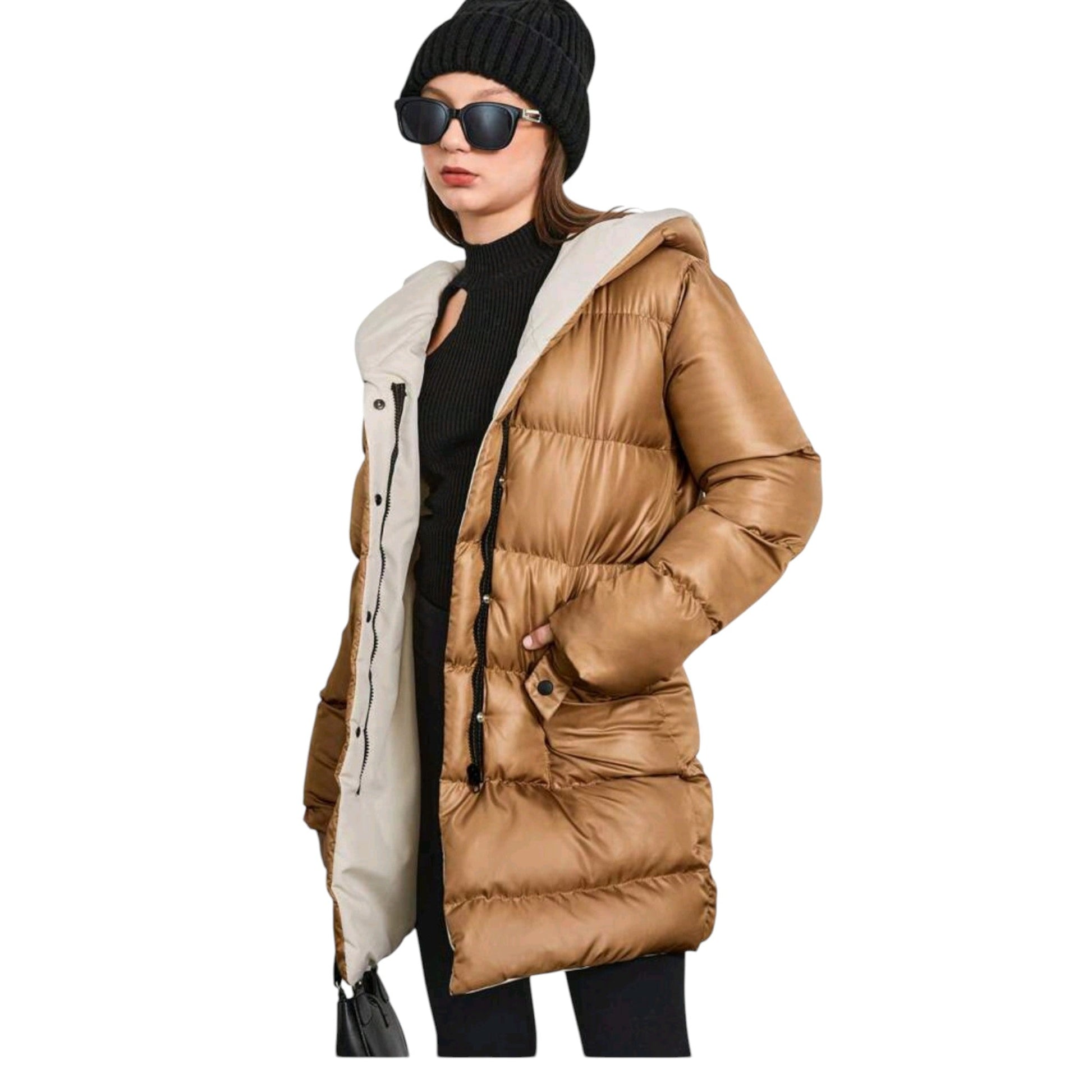 Címke nélküli, barna, hosszú, steppelt téli kabát, megfordítható (másik oldala krém), kapucnival, elöl cipzárral és patenttal záródik.