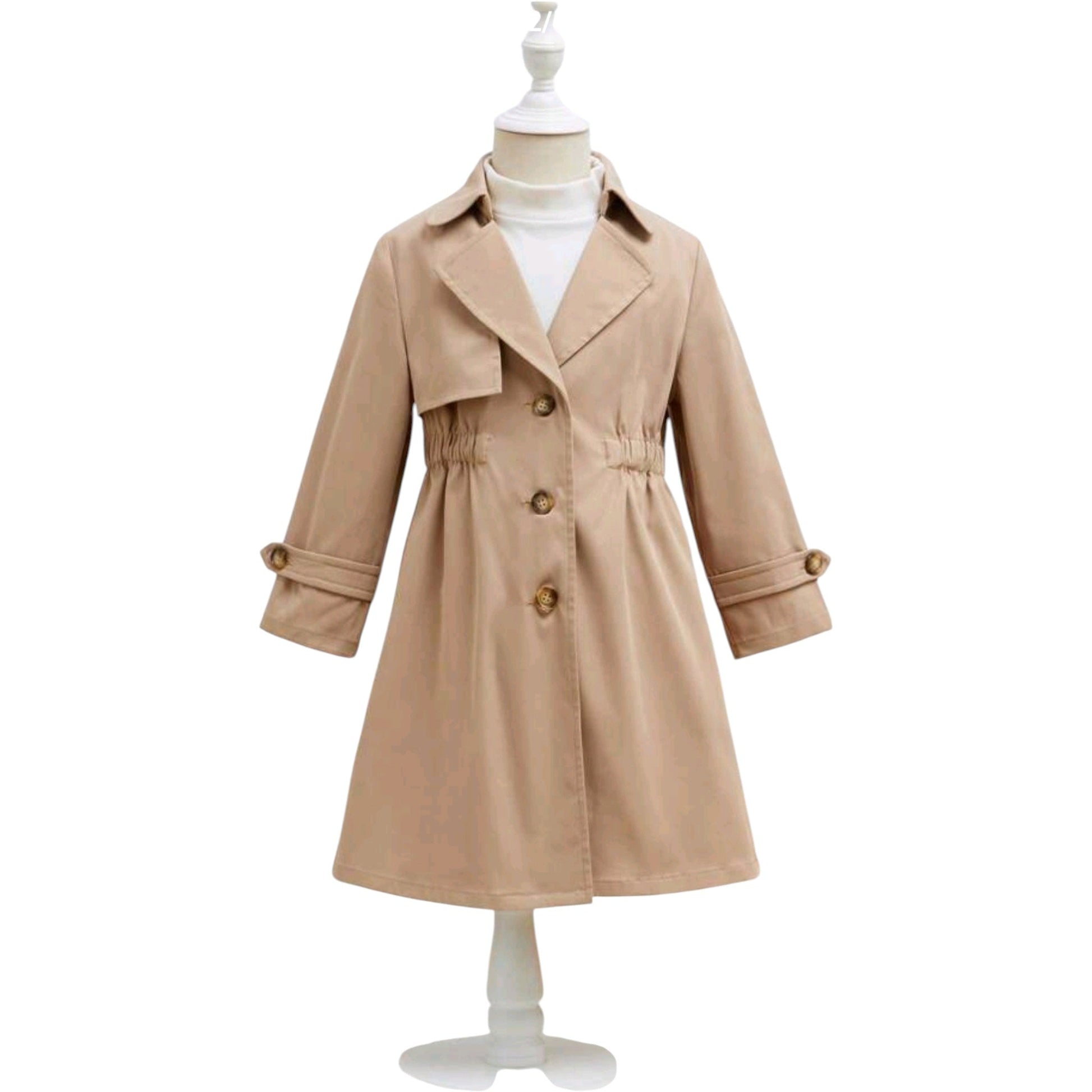 Címke nélküli, bézs, galléros, hosszú ujjú, ujjvégén gombos pánttal, elöl gombos, ráncolt derekú, hosszított fazonú, könnyű ballon kabát.