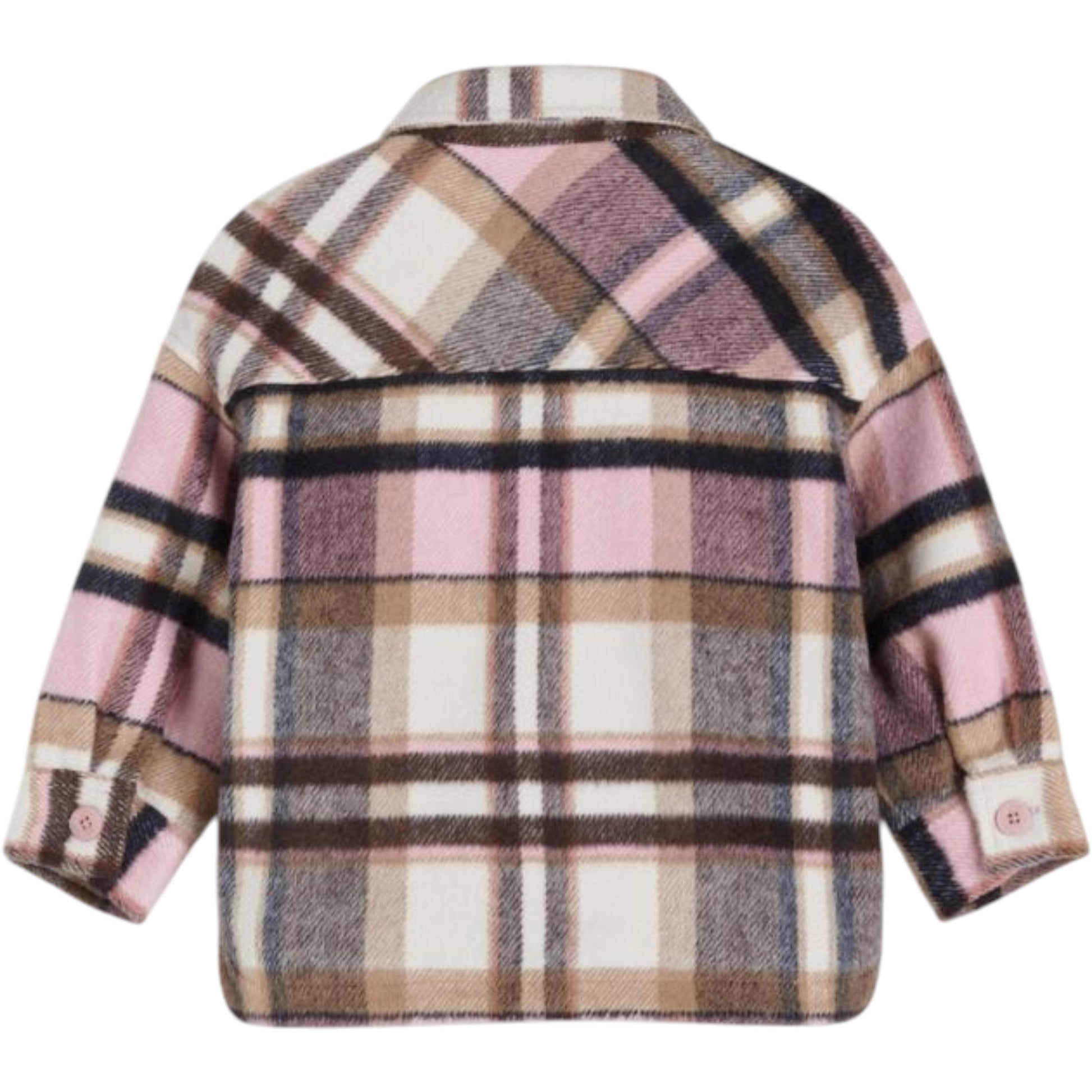 Címke nélküli, rózsaszín, rövid, vastag anyagú kabát. Fekete, barna, bézs és fehér színű kockás mintával. Hátul a vállrésznél vízszintes betéttel.