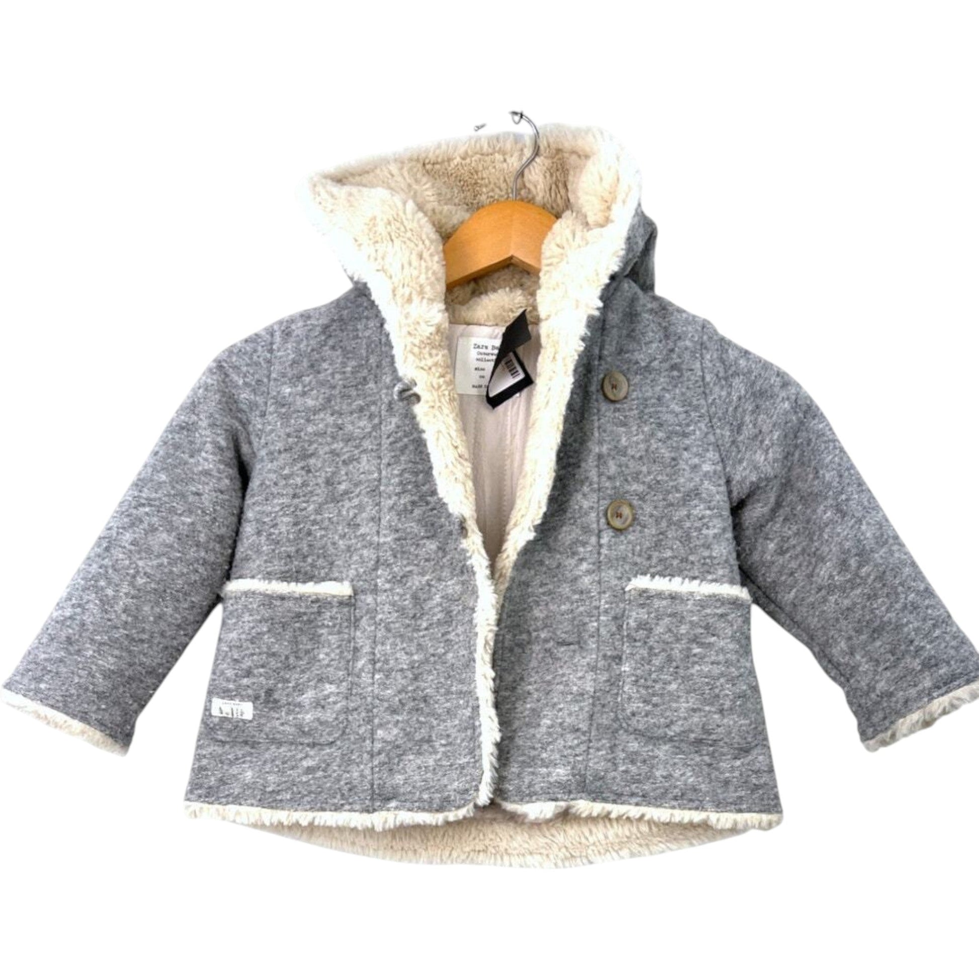Címke nélküli, szürke, hosszú ujjú, kapucnis kabát. Krémfehér színű sherpa béléssel, szegéllyel és mandzsettával. Elöl két nagy gombos záródással.