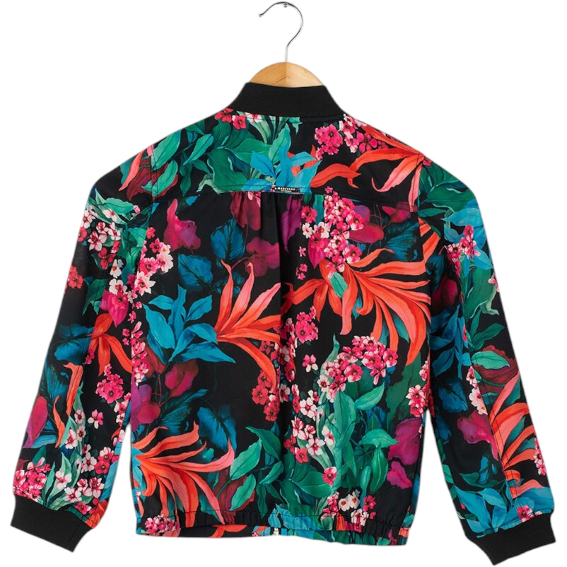 Címke nélküli, fekete alapon színes virágos és trópusi mintás, rövid bomber dzseki. Fekete passzéval a deréknál, a nyaknál és a mandzsettáknál.