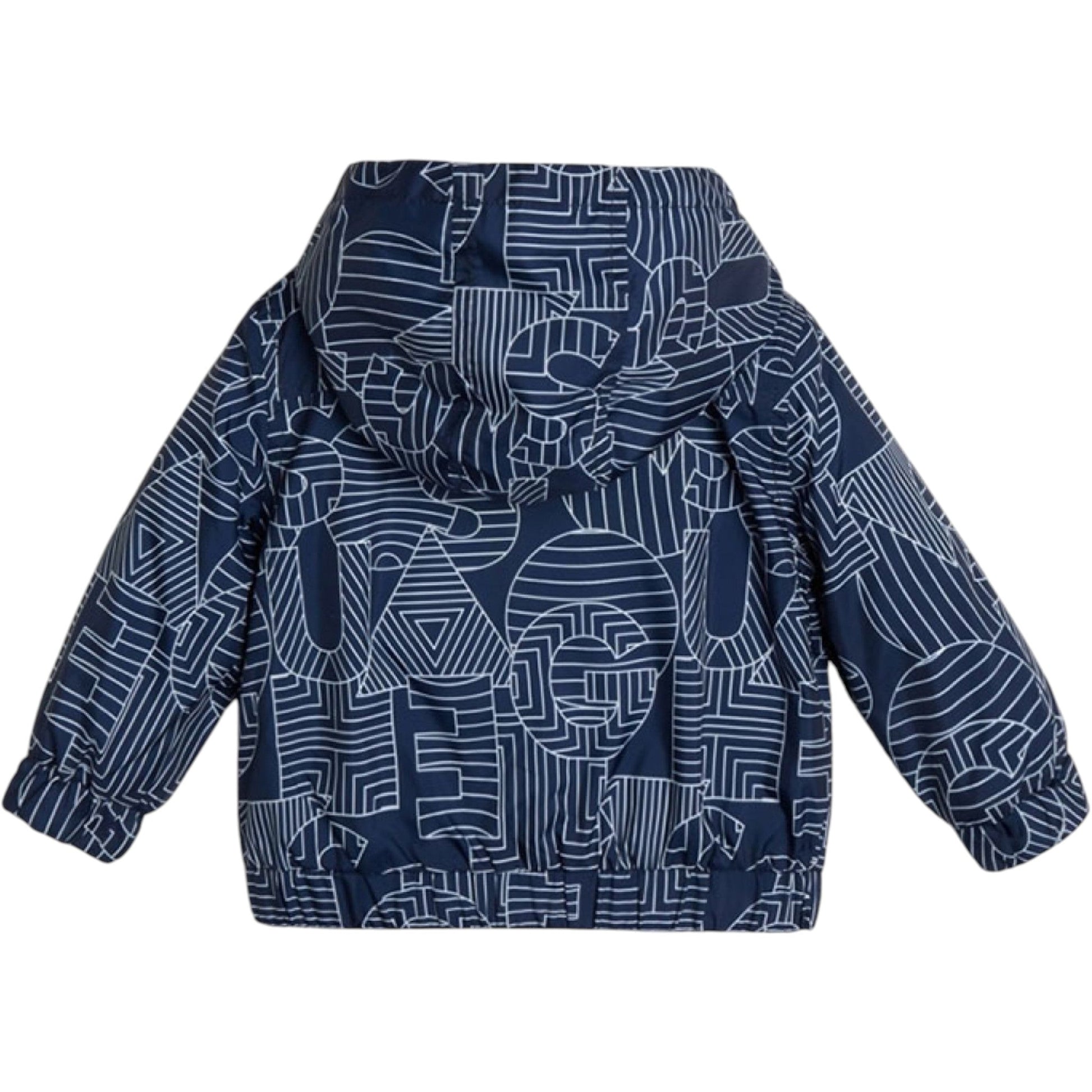 Címke nélküli, sötétkék, hosszú ujjú, kapucnis széldzseki. Fehér grafikus, labirintus hatású mintával. Elöl cipzáras záródással.
