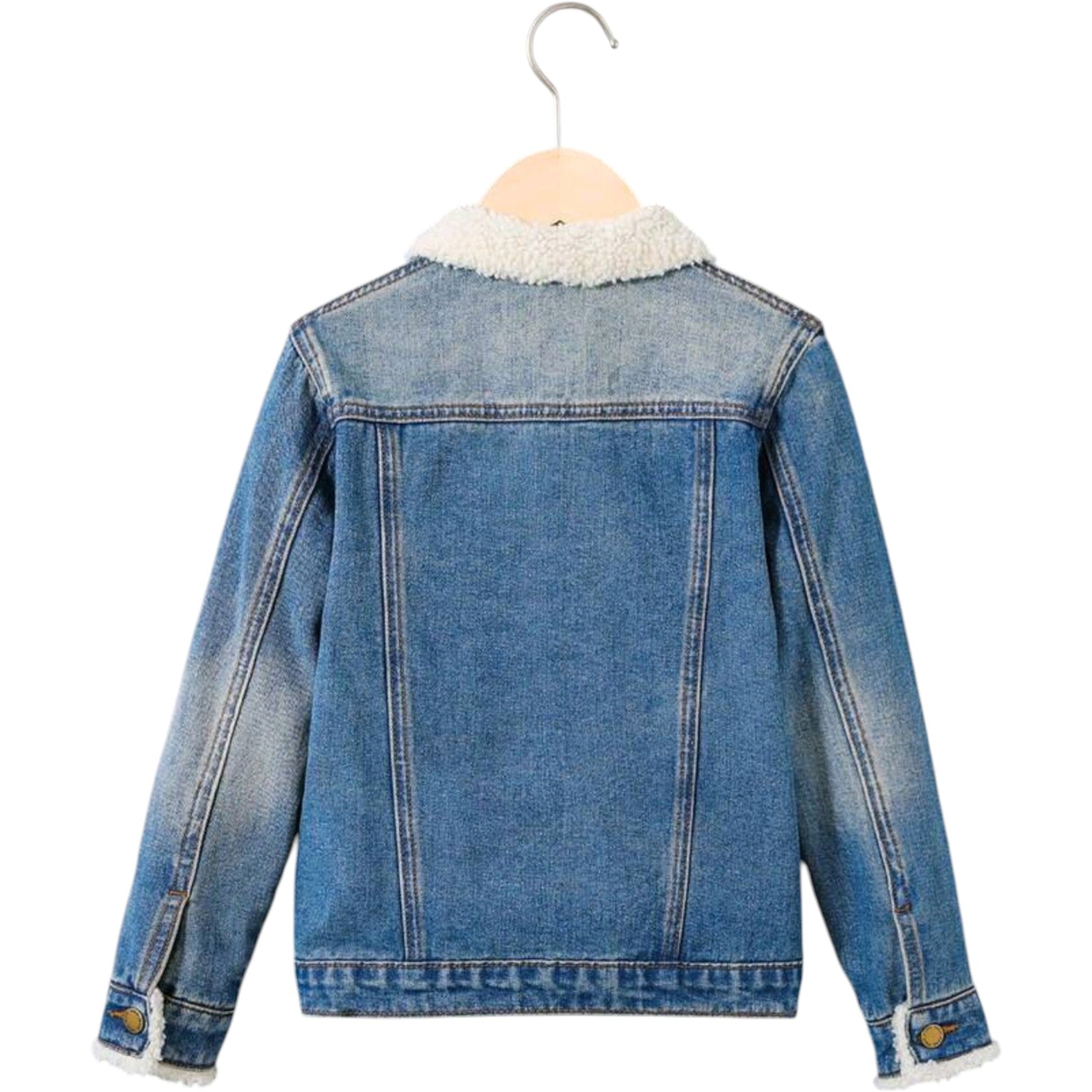 Címke nélküli, kék, hosszú ujjú, farmer dzseki. Fehér, gyapjú hatású sherpa gallérral és szegéllyel. Elöl gombsoros záródással és fémes gombokkal.