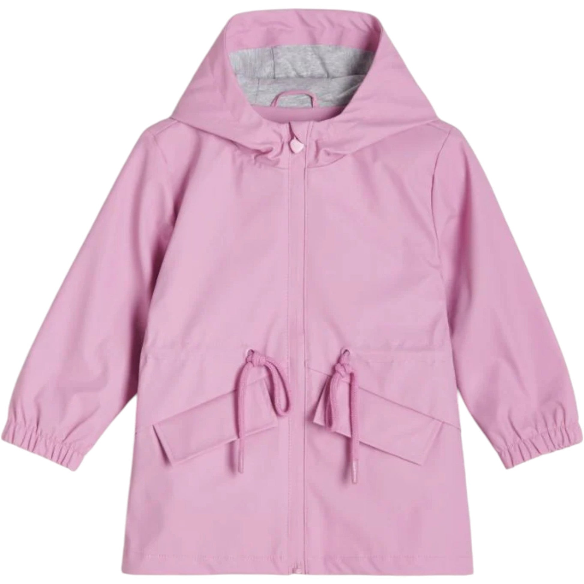 Címke nélküli, rózsaszín, kapucnis, hosszú ujjú esőkabát. Vízlepergető anyagú, derékon húzózsinórral, elöl patentos záródással. A kapucni szegélye szürke színű.