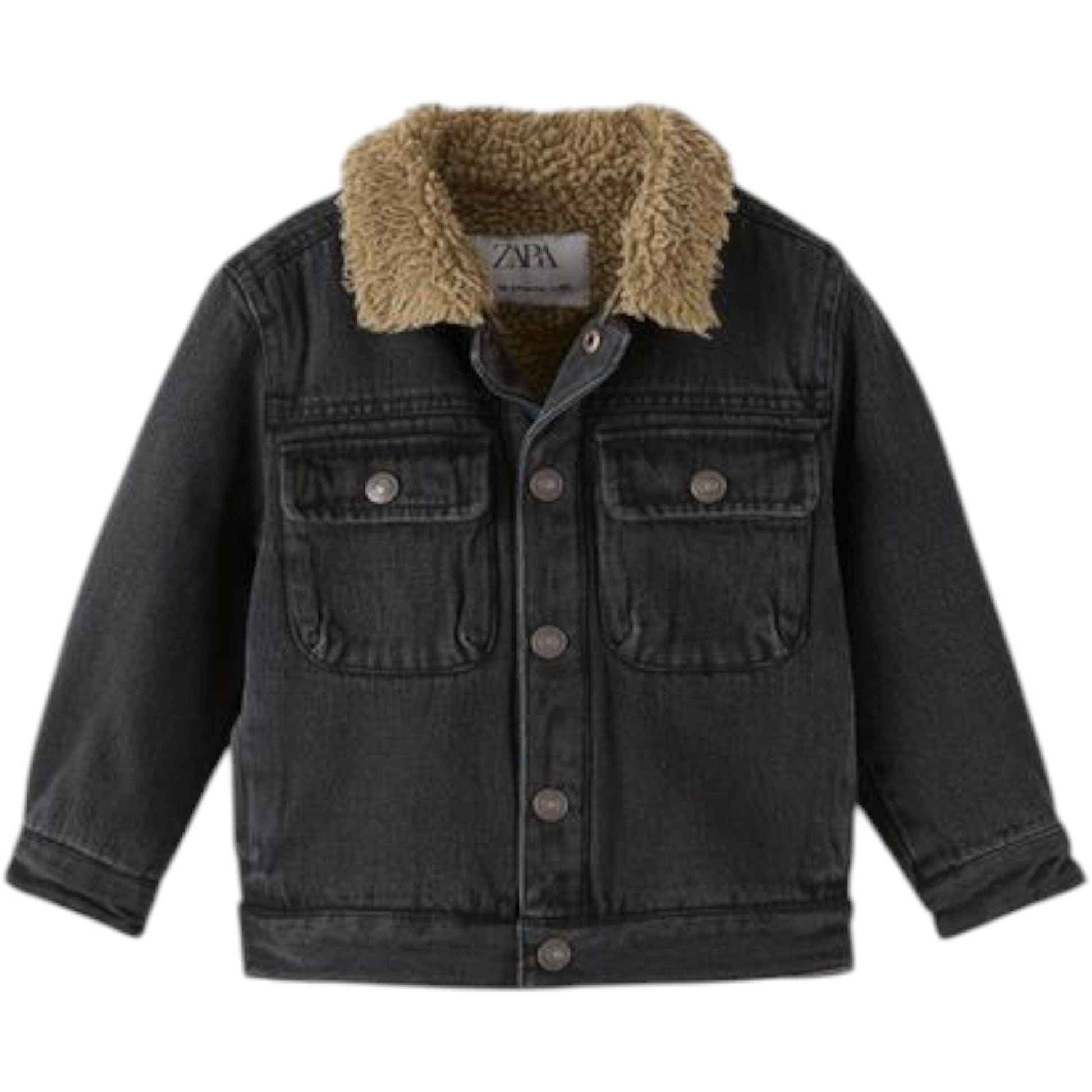 Címke nélküli, sötétszürke, hosszú ujjú, farmer hatású dzseki. Barna színű, gyapjú hatású sherpa gallérral. Elöl gombsoros záródással és fémes gombokkal.