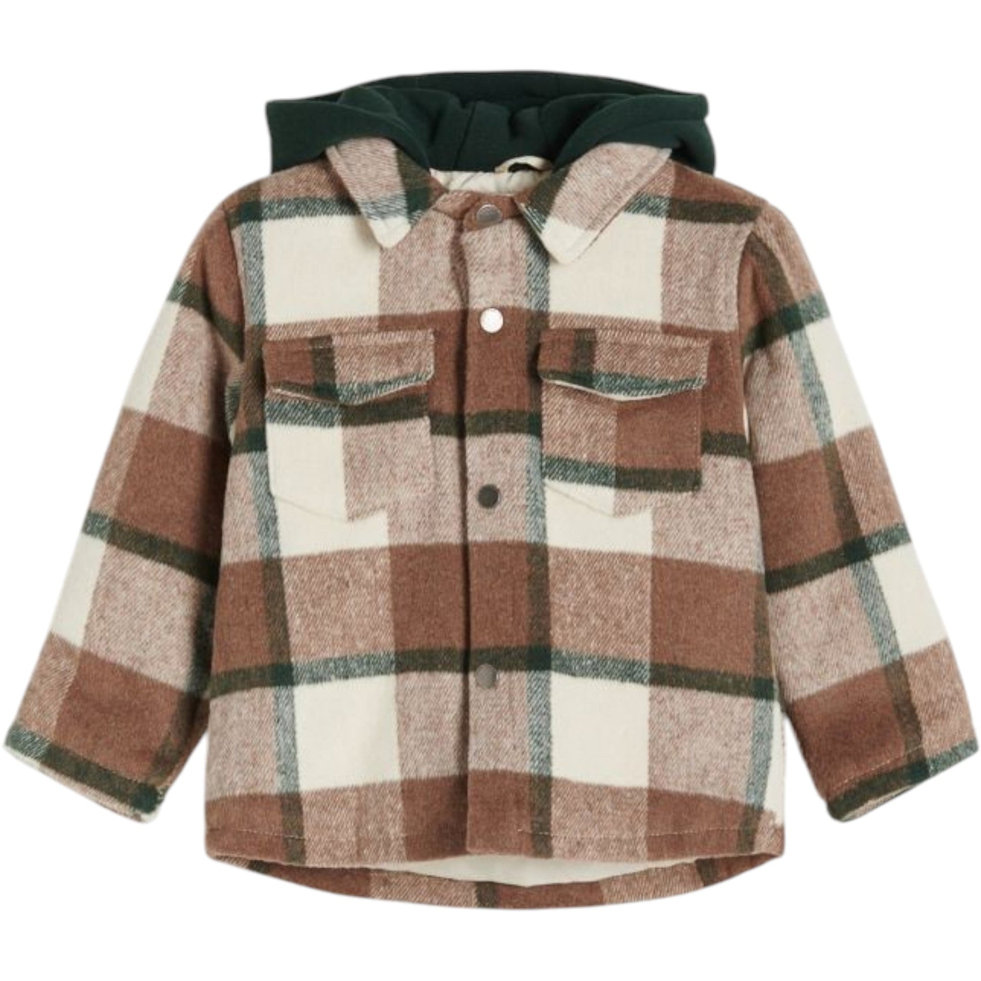 Címke nélküli, barna és bézs színű kockás, rövid kabát. Sötétzöld színű levehető kapucnival. Elöl gombsoros záródással.