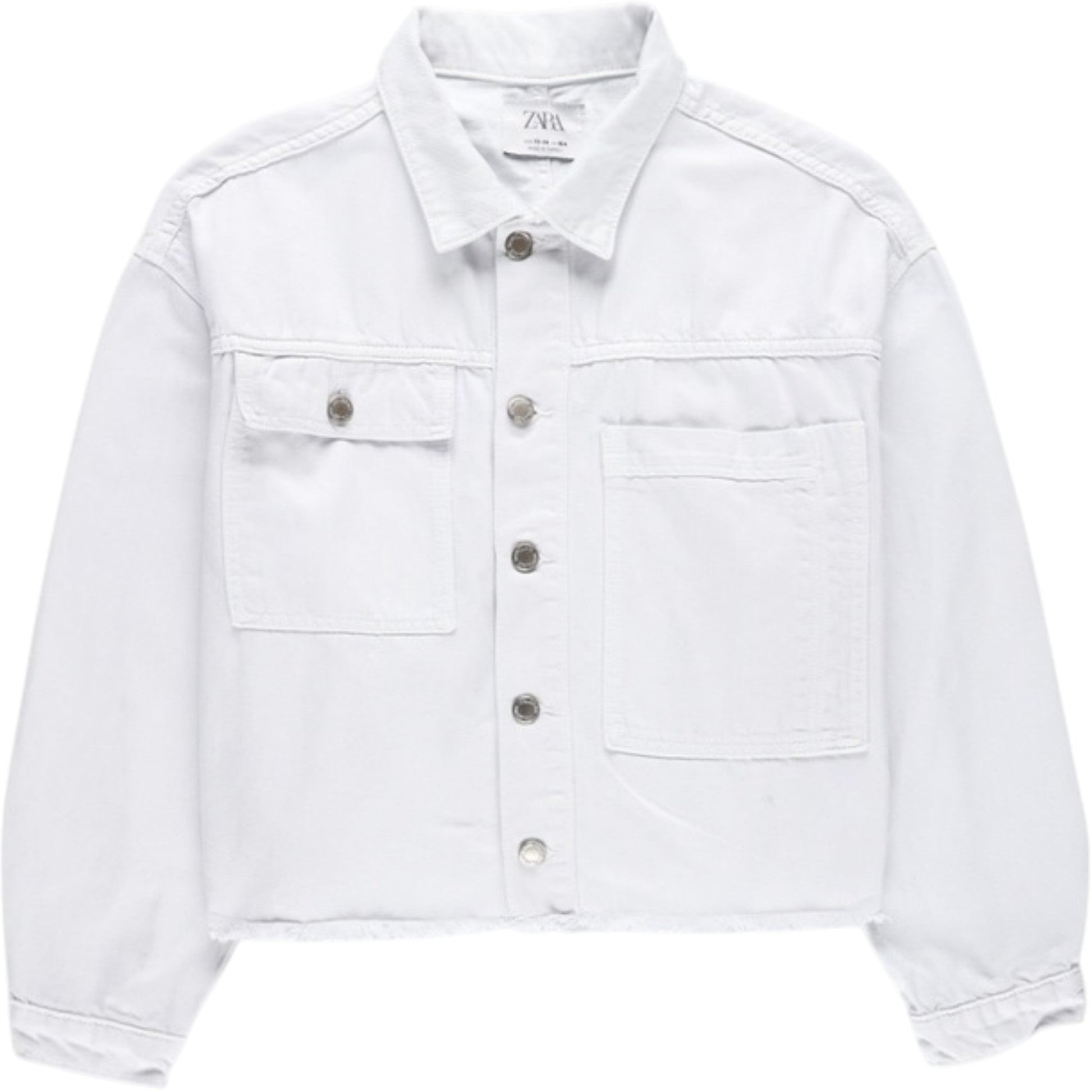 Címke nélküli, fehér, rövid fazonú, farmer dzseki. Hosszú ujjú, galléros, elöl gombsoros záródással. A dzseki alja rojtos.