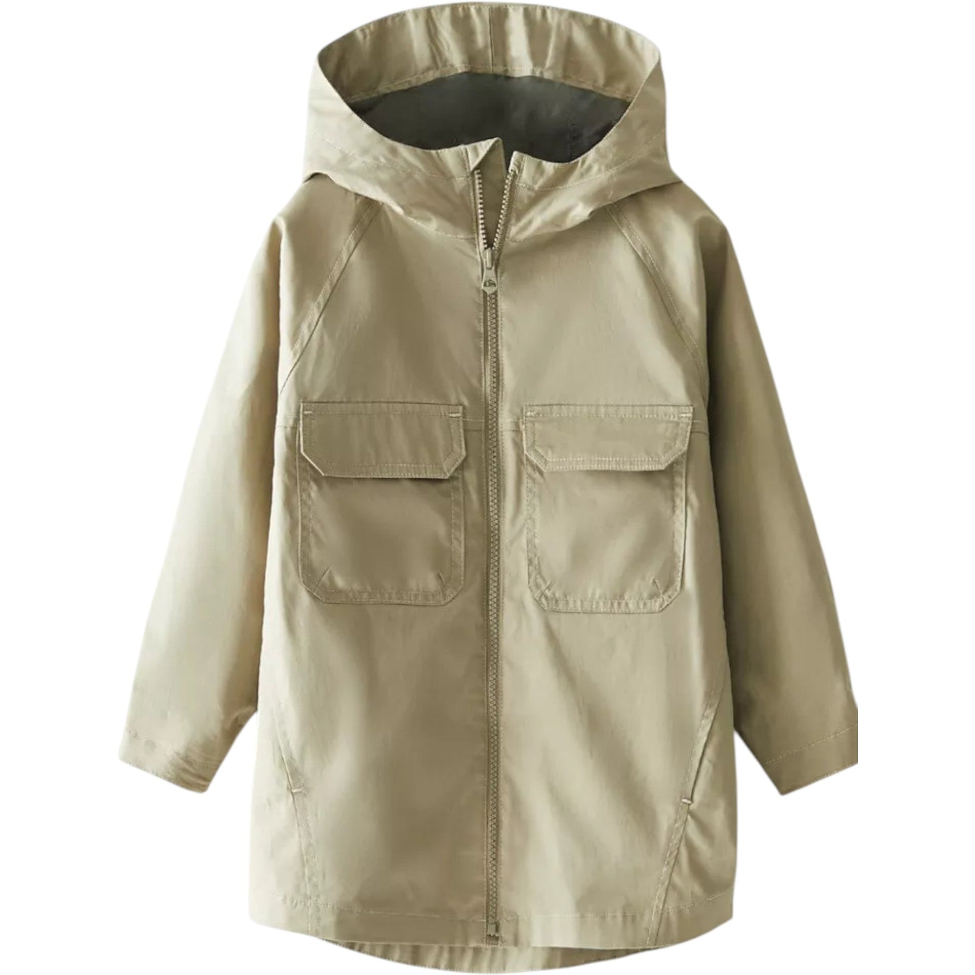 Címke nélküli, bézs, kapucnis, hosszú ujjú esőkabát. Zipzárral záródik, kapucnival, elöl rátett zsebfedős zsebekkel, hosszú fazon.