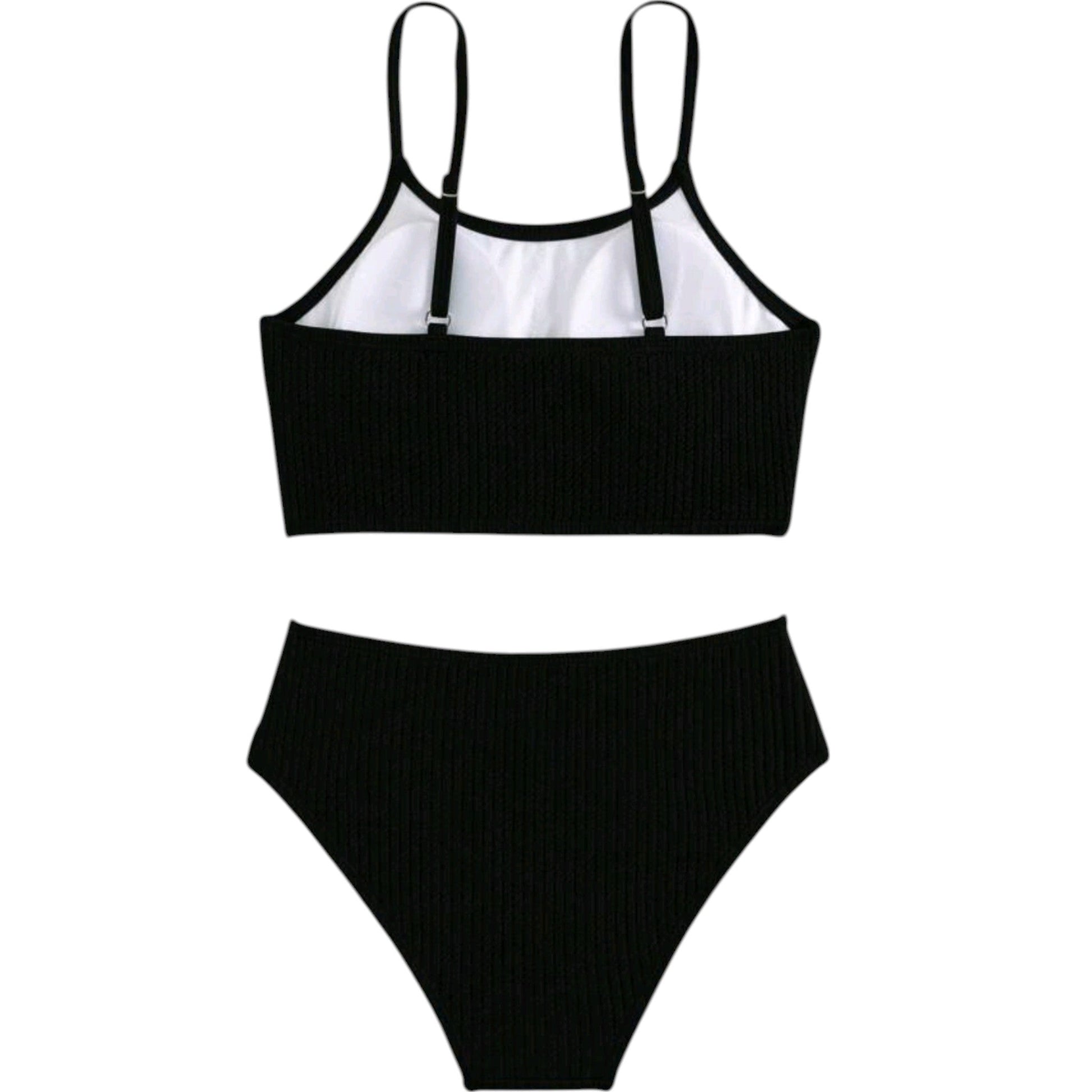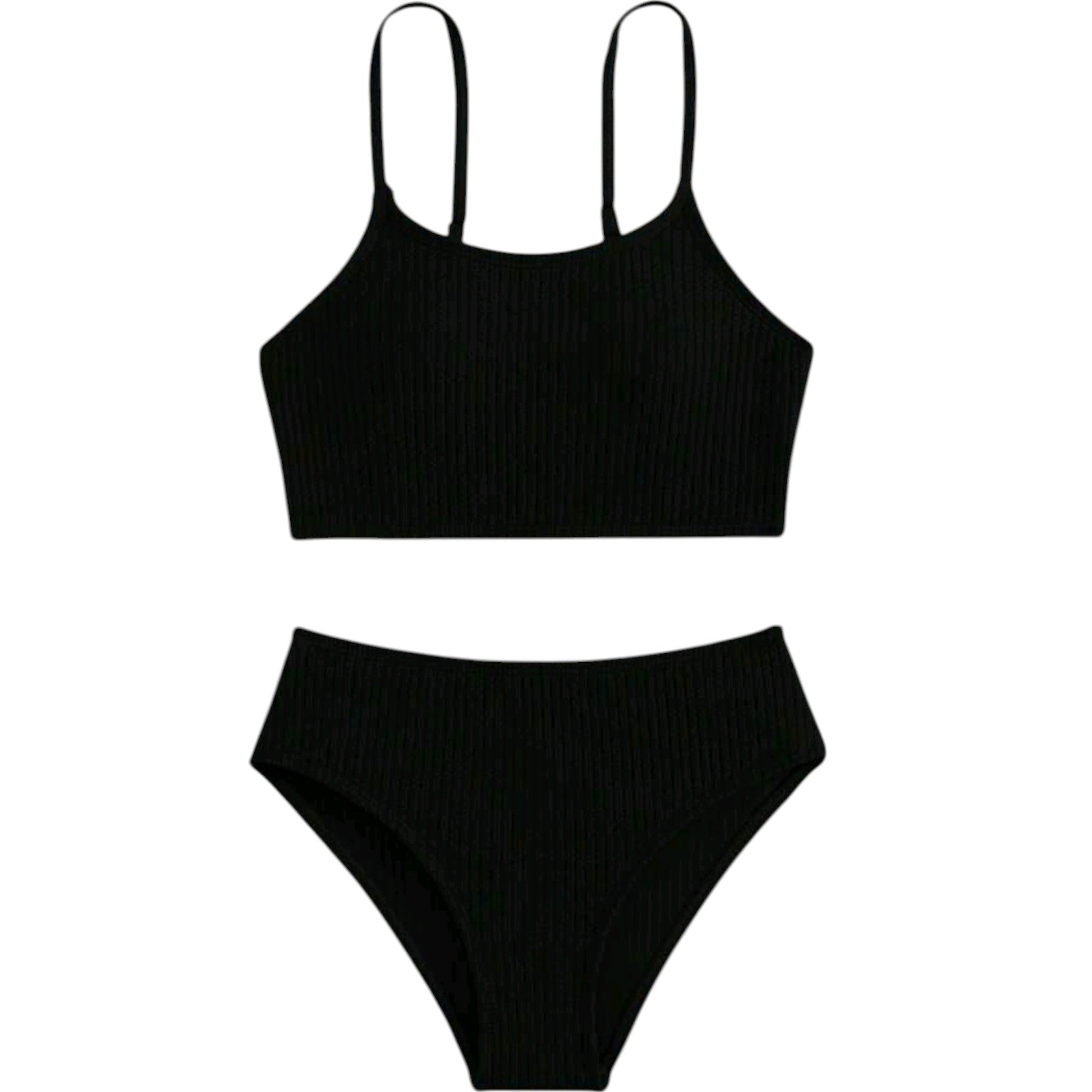 Címke nélküli, fekete, bordázott anyagú, sportos bikini szett, vékony pántos crop top és magas derekú alsó.