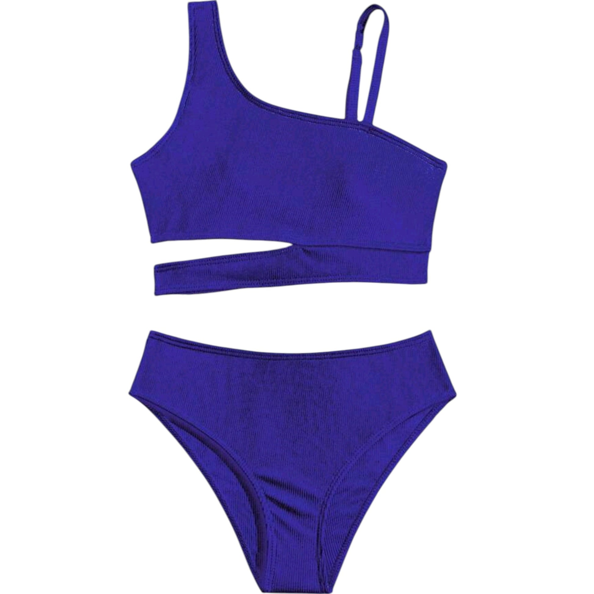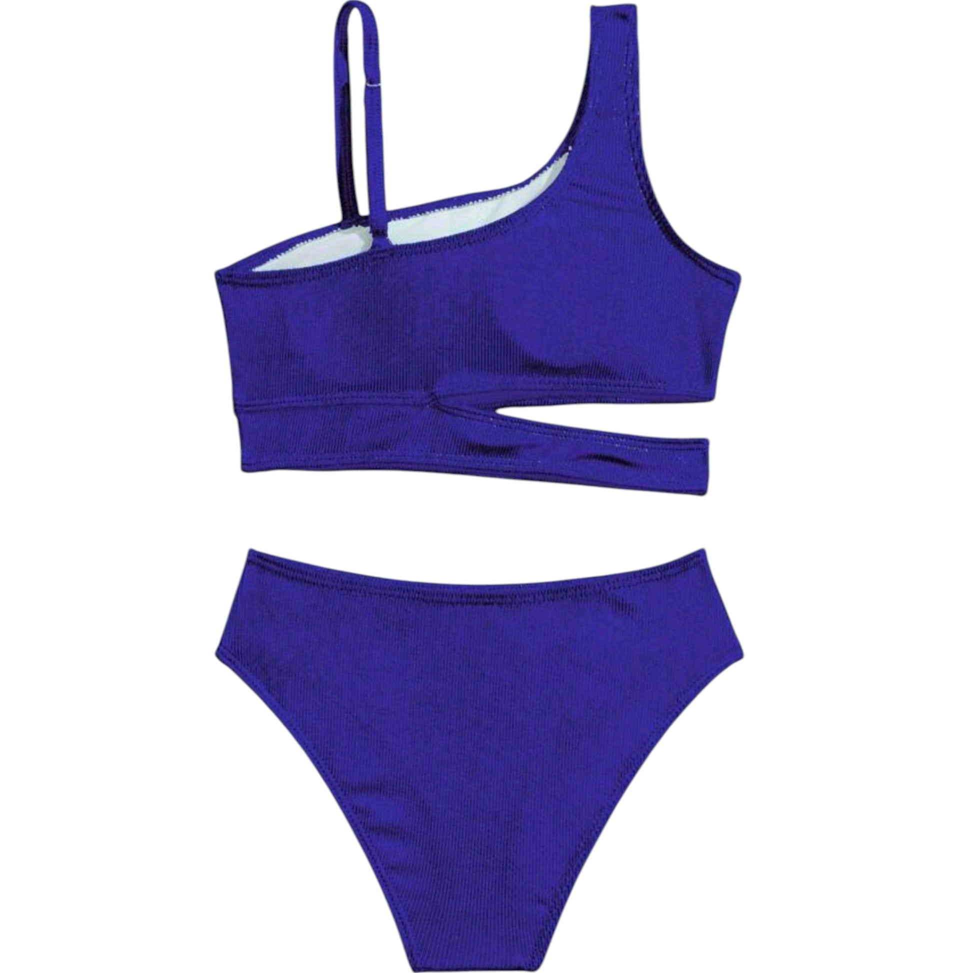 Címke nélküli, lila, bordázott anyagú, asszimetrikus, kivágott top és magas derekú alsó.