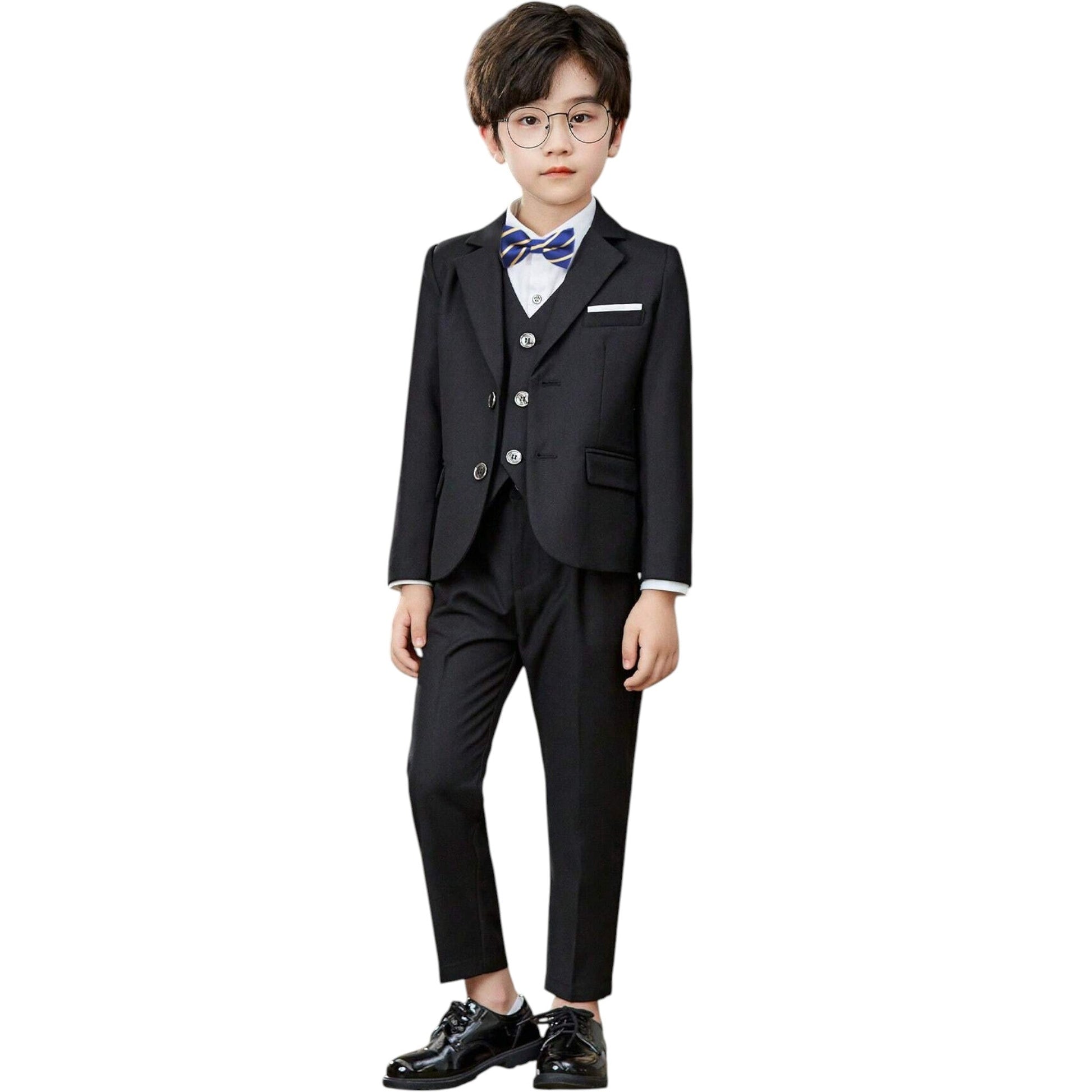 Címke nélküli, fekete, 3 részes öltöny szett fiúknak, zakóval, mellényel és nadrággal.