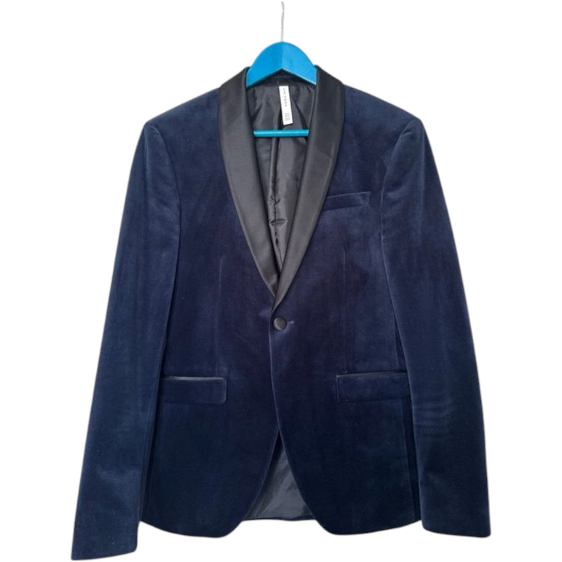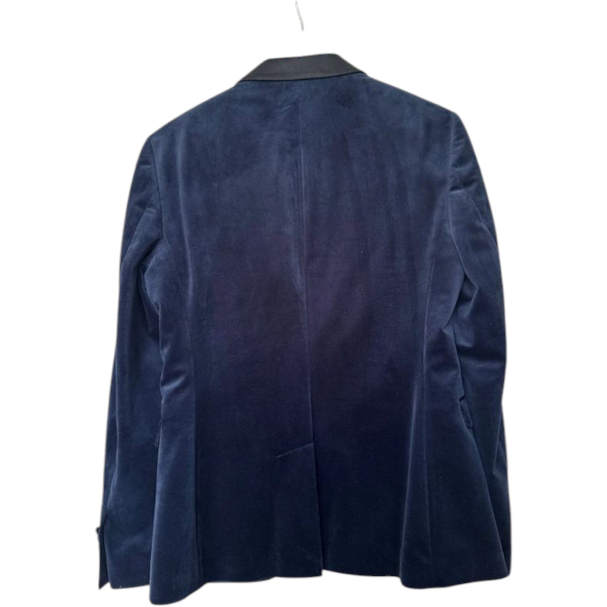 Címke nélküli, kék, egygombos, bársony anyagú, fekete szatén sálgallér, hosszú ujjú, két zseb