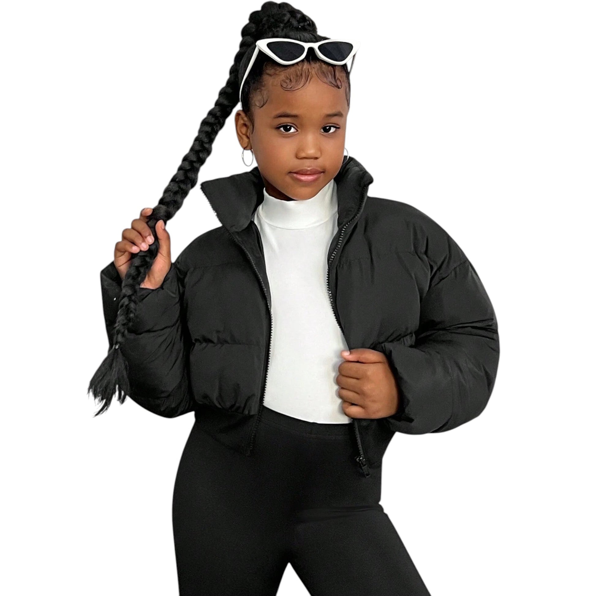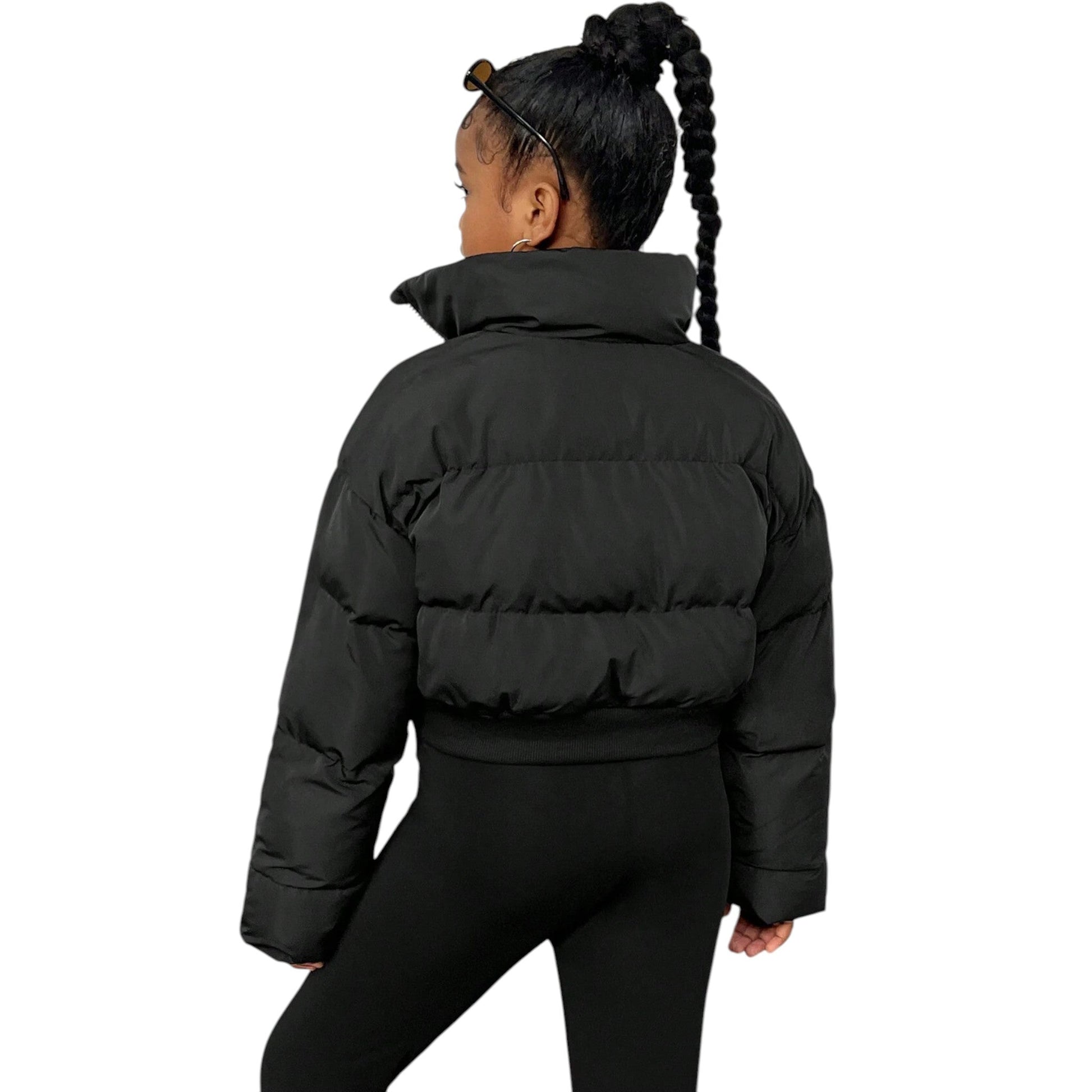 Címke nélküli, fekete, rövid szabású pufi dzseki, magas gallérral és cipzáras záródással.