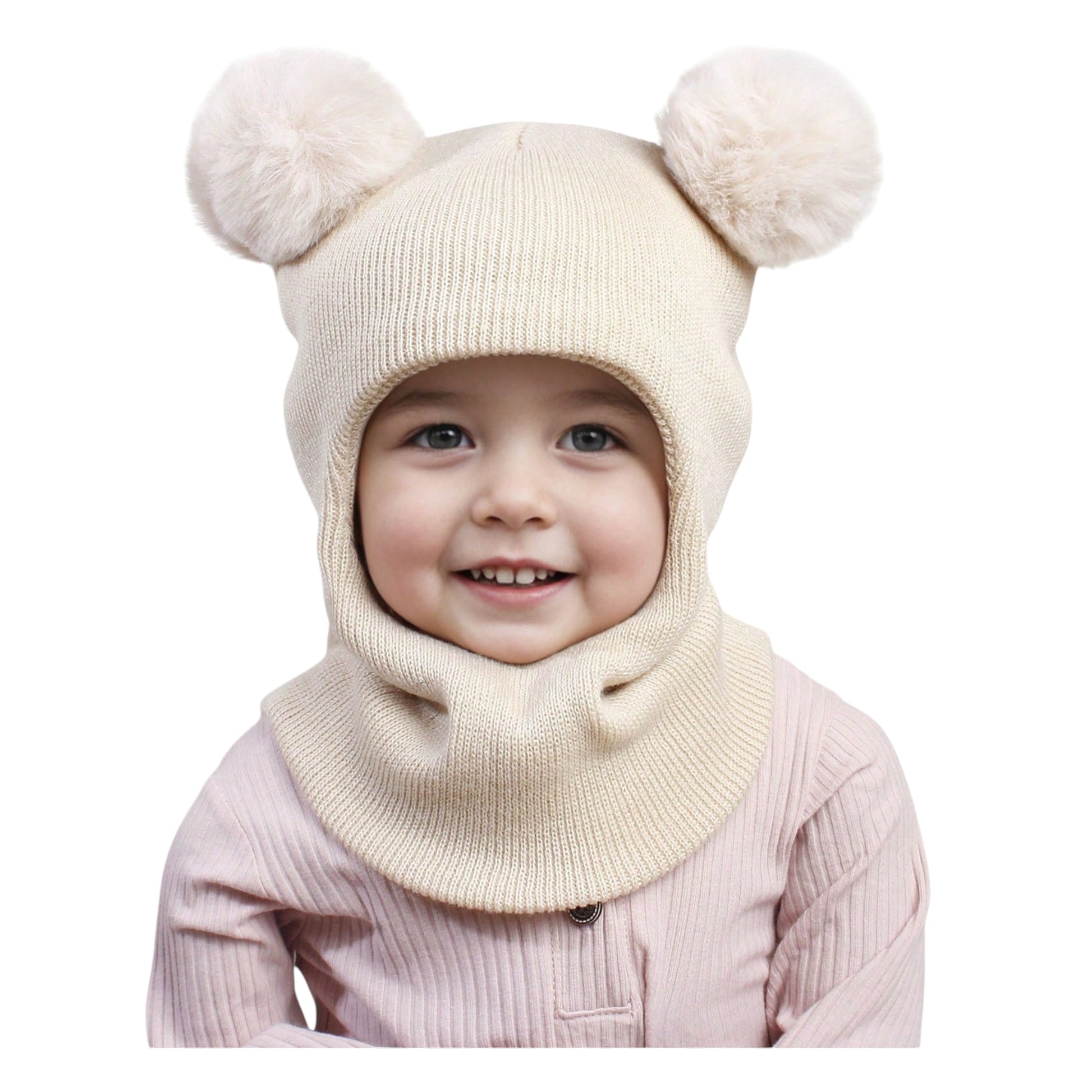 Címke nélküli, drapp, kétrészes gyerek sapka, maci füllel és két bojttal.