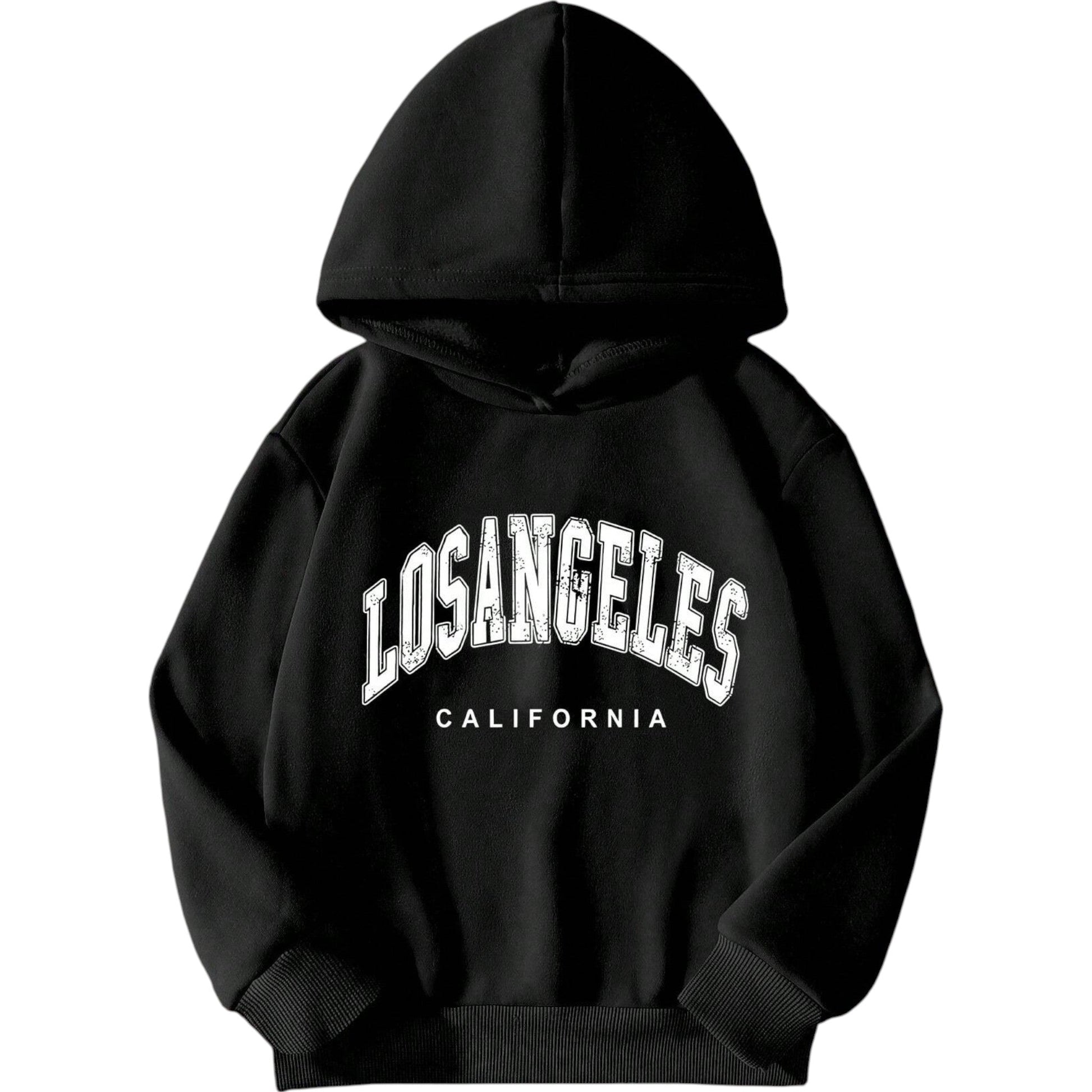 Címke nélküli, fekete, kapucnis, "LOSANGELES CALIFORNIA" felirattal.