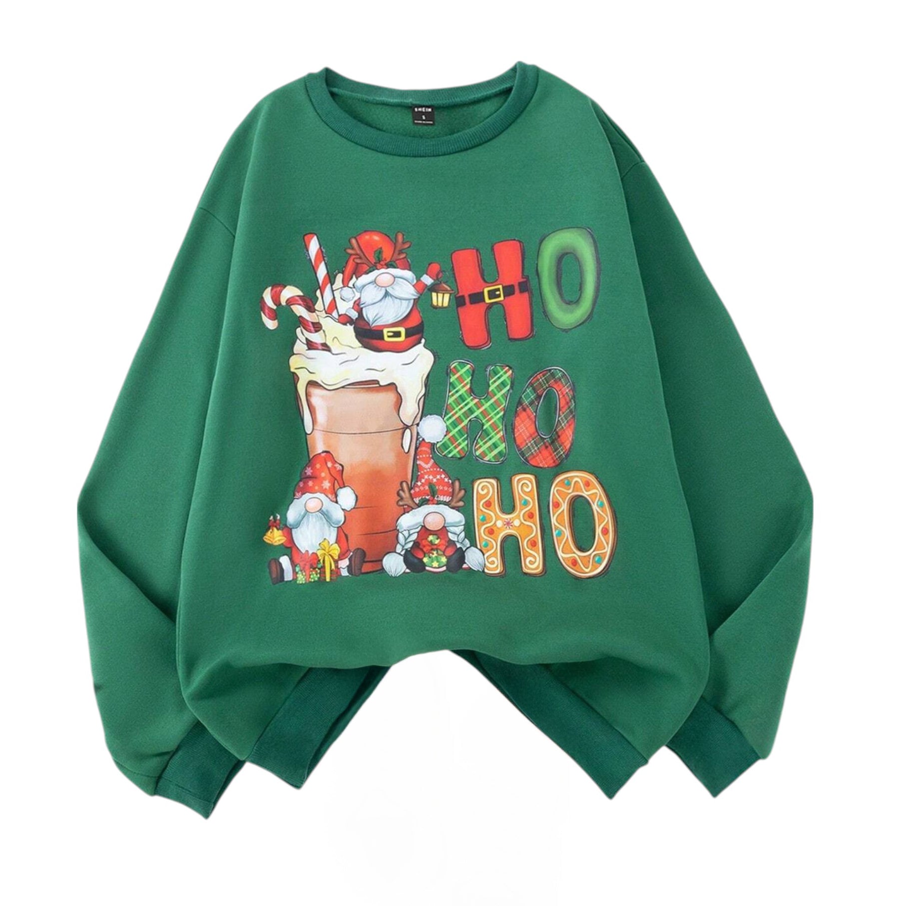 Címke nélküli, zöld, kerek nyakú, hosszú ujjú pulóver, karácsonyi manó és "HO HO HO" mintával.