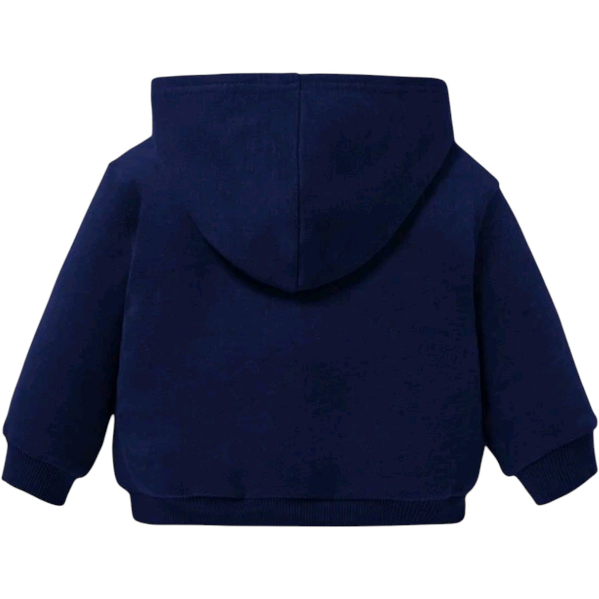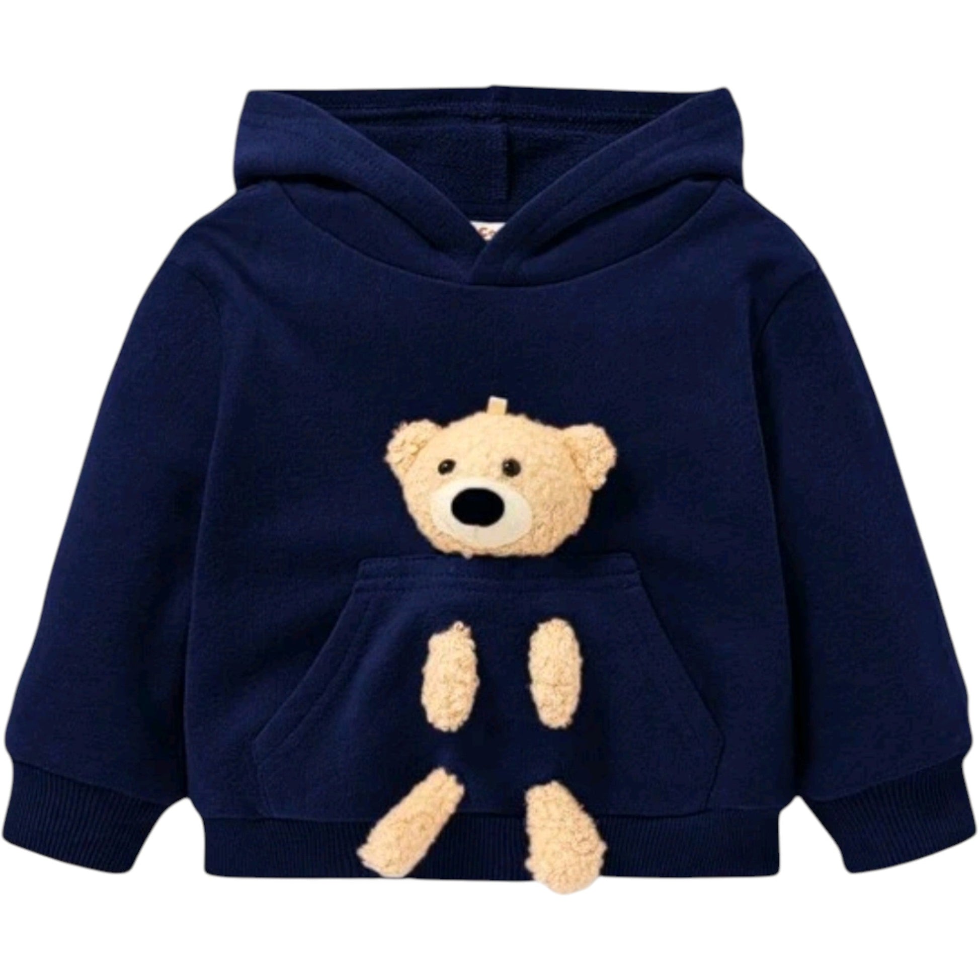 Címke nélküli, sötétkék, kapucnis, hosszú ujjú, bordás mandzsettájú és aljú, maci mintás (3D maci fej és lábak), vastag pulóver.