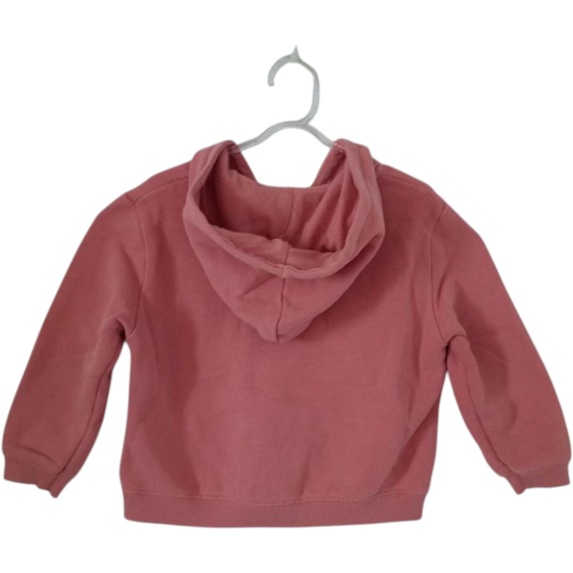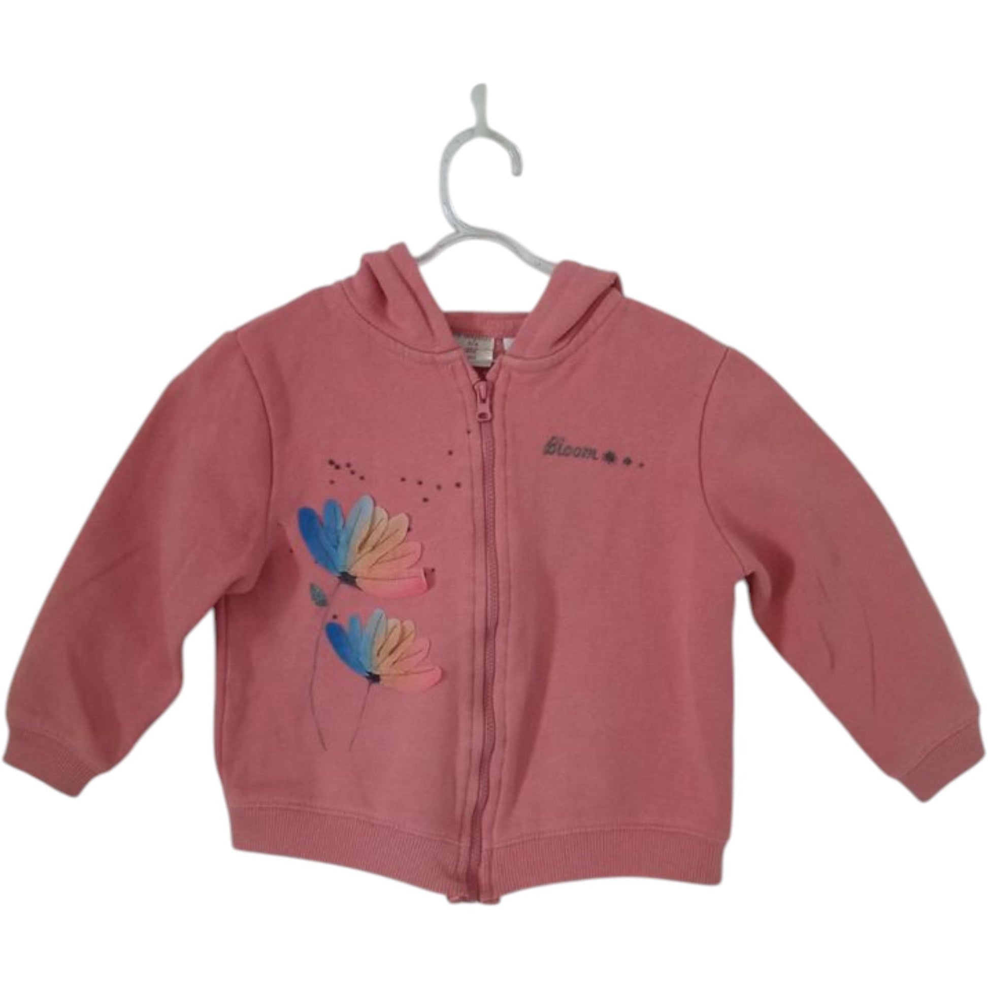 Címke nélküli, mályva (rózsaszín), elöl cipzáros, kapucnis, hosszú ujjú, bordás mandzsettájú és aljú, virágmintás (hímzett/applikált virágok és "Bloom" felirat) pulóver.