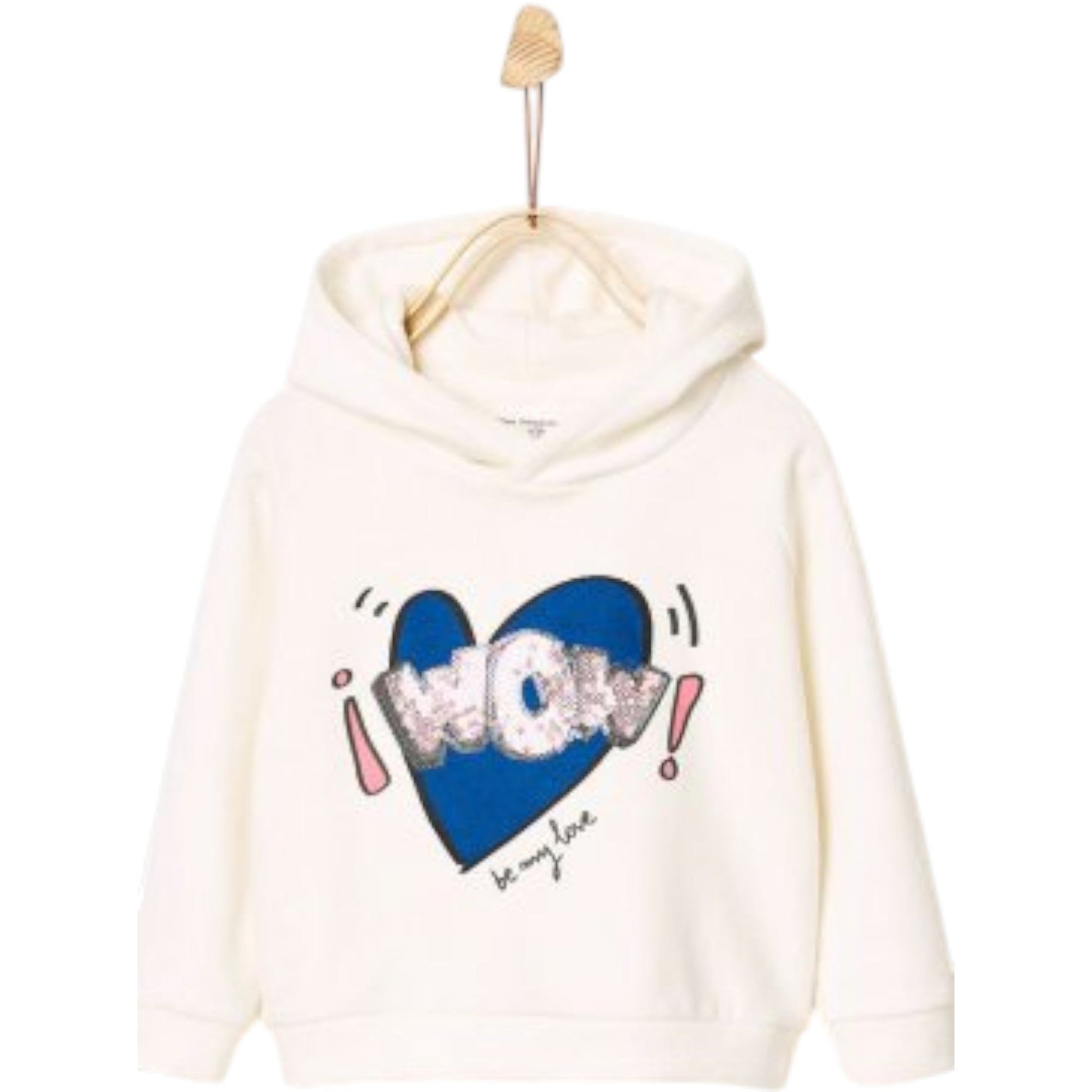 Címke nélküli, ekrü (törtfehér), kapucnis, hosszú ujjú, bordás mandzsettájú és aljú, elöl nagy kék szívecske és flitteres "WOW" felirat díszítés, valamint "be my love" felirat, vastag pulóver.