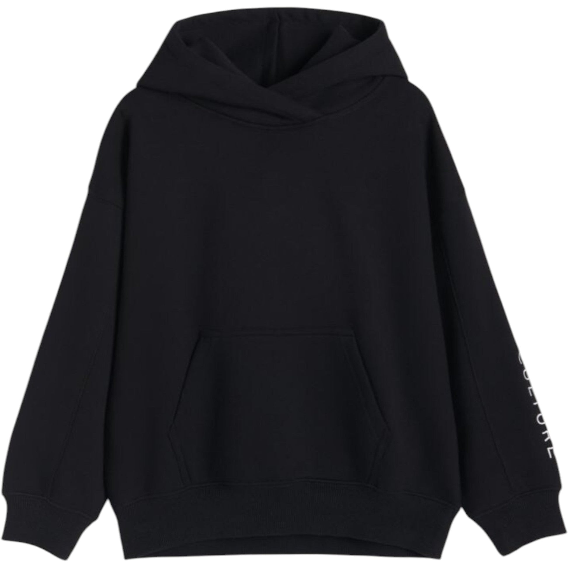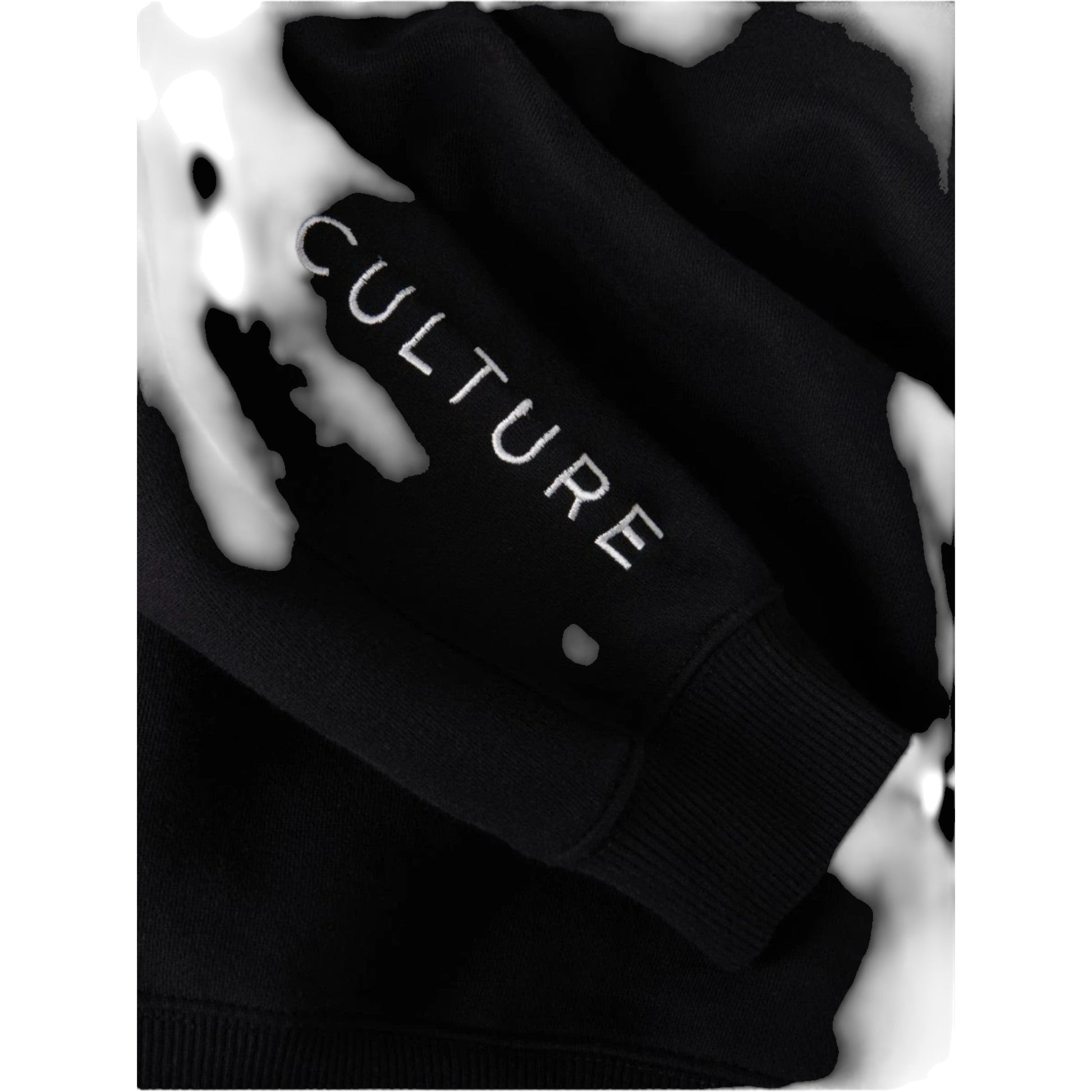 Címke nélküli, fekete, kapucnis pulóver, nagy kenguru zsebbel. Bordázott mandzsettával és aljjal. Fehér, kontrasztos 'CULTURE' hímzés a karon.