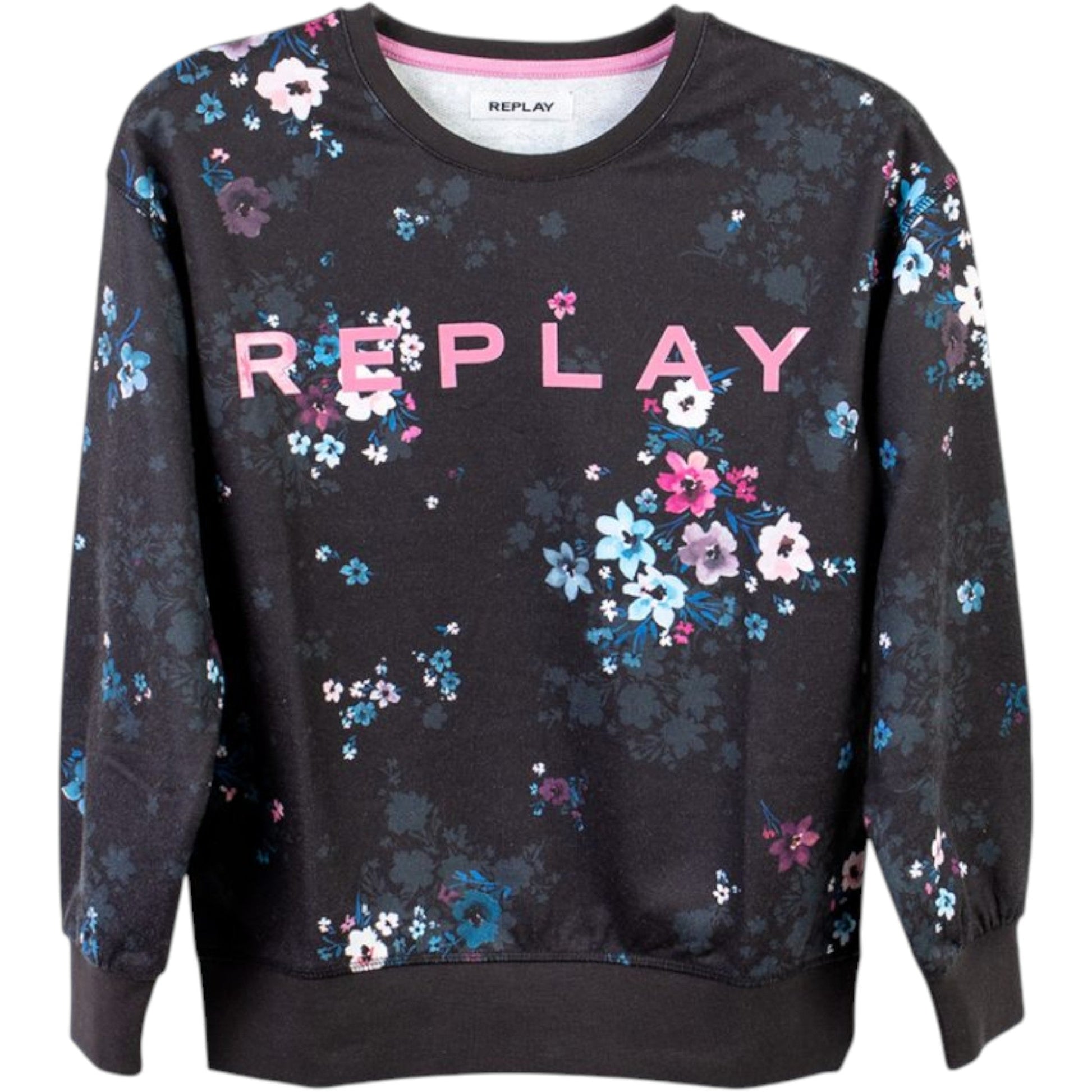 Címke nélküli, fekete alapszínű, színes virágmintás pamut pulóver. Kerek nyakú, bordázott nyakkivágással, mandzsettával és aljjal. Mellrészen kontrasztos rózsaszín 'REPLAY' felirat látható.