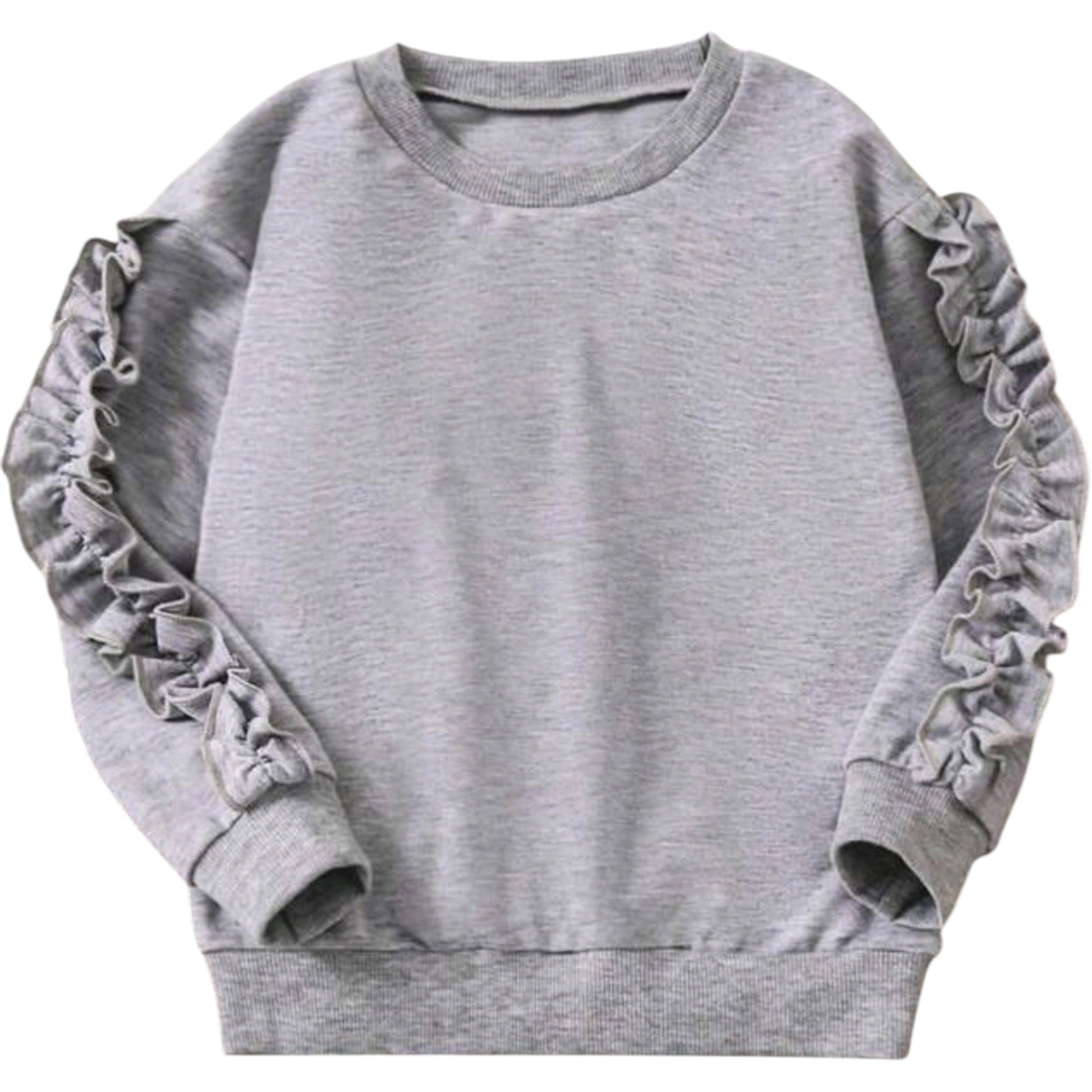 Címke nélküli, szürke, hosszú ujjú, bordázott passzés szegélyű és ujjvégekkel, kerek nyakú, az ujjakon függőlegesen futó fodor díszítéssel.