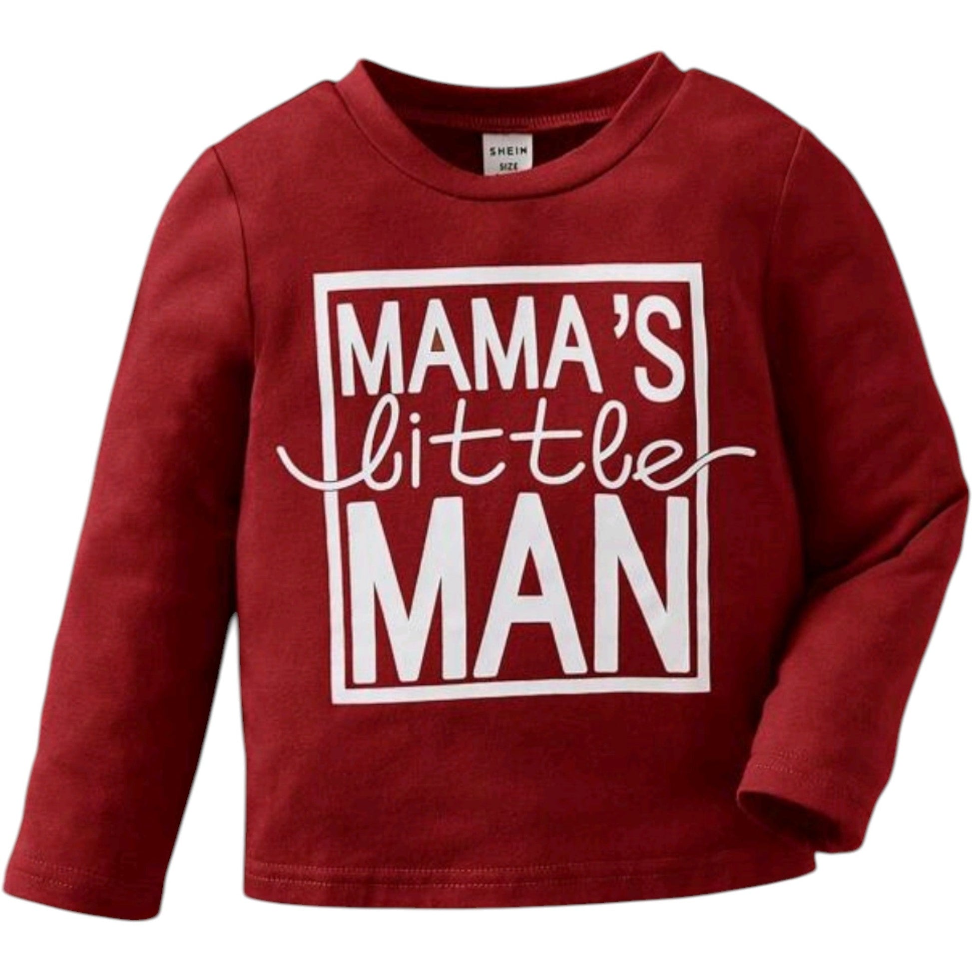 Címke nélküli, bordó, hosszú ujjú, kerek nyakú, bordázott passzés szegéllyel és ujjvégekkel, az elején fehér felirattal: "MAMA'S little MAN".