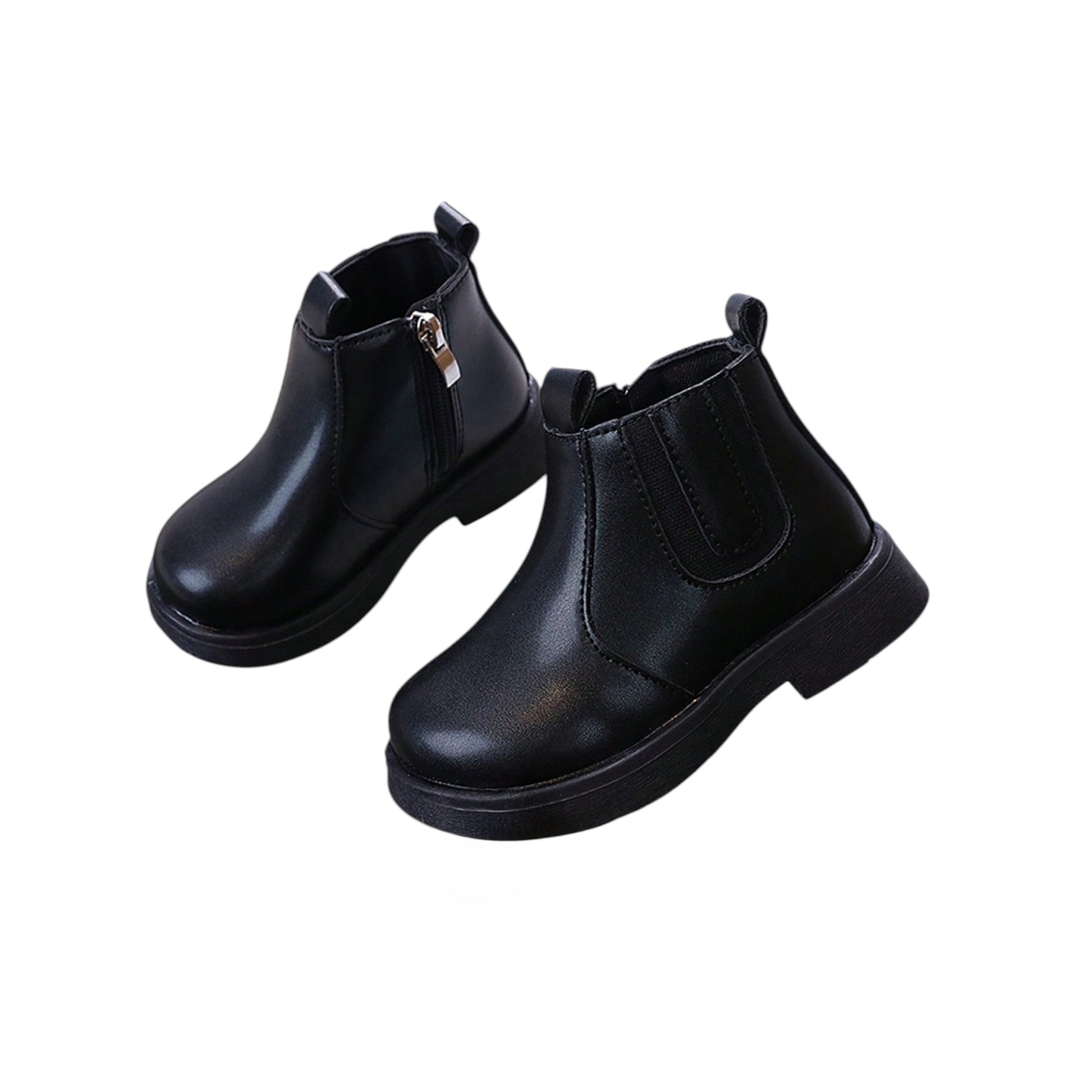 Címke nélküli, fekete, műbőr Chelsea stílusú bokacsizma, oldalsó cipzárral és rugalmas panellel, vastag talppal.