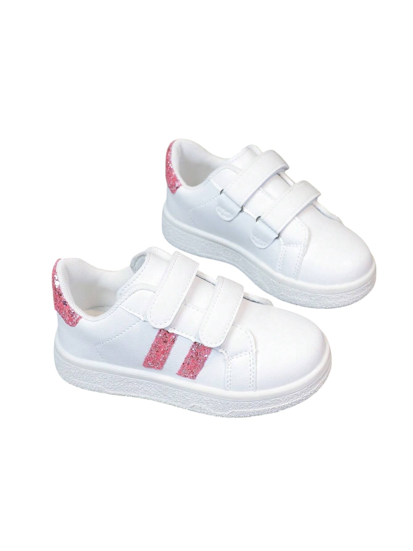 Címke nélküli, fehér, rózsaszín csíkos és csillámos részletekkel, tépőzáras cipő. Belső talp hossz: 20,8cm