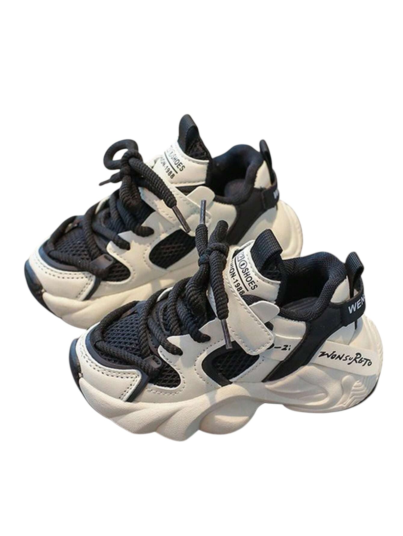 Címke nélküli, fekete és fehér színű, fűzős és tépőzáras sportcipő kisfiúnak feliratokkal