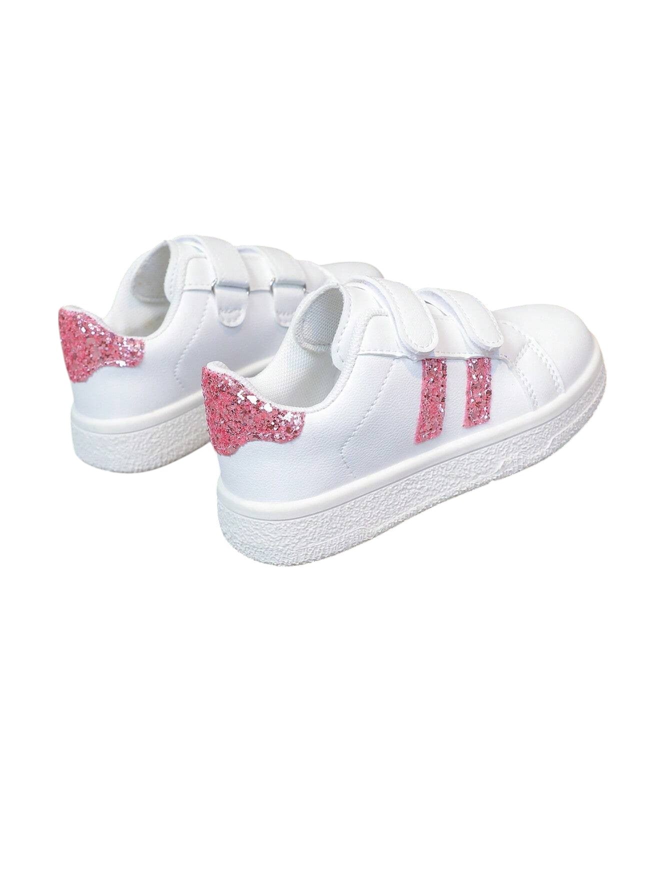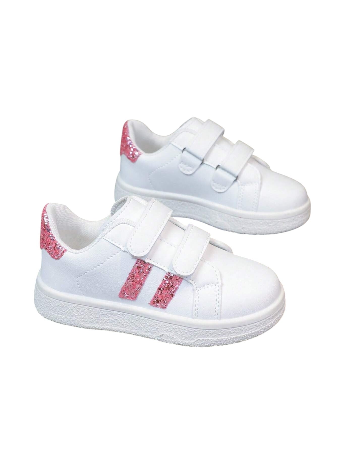 Címke nélküli, fehér műbőr tépőzáras cipő rózsaszín csíkokkal és sarokrésszel kislánynak