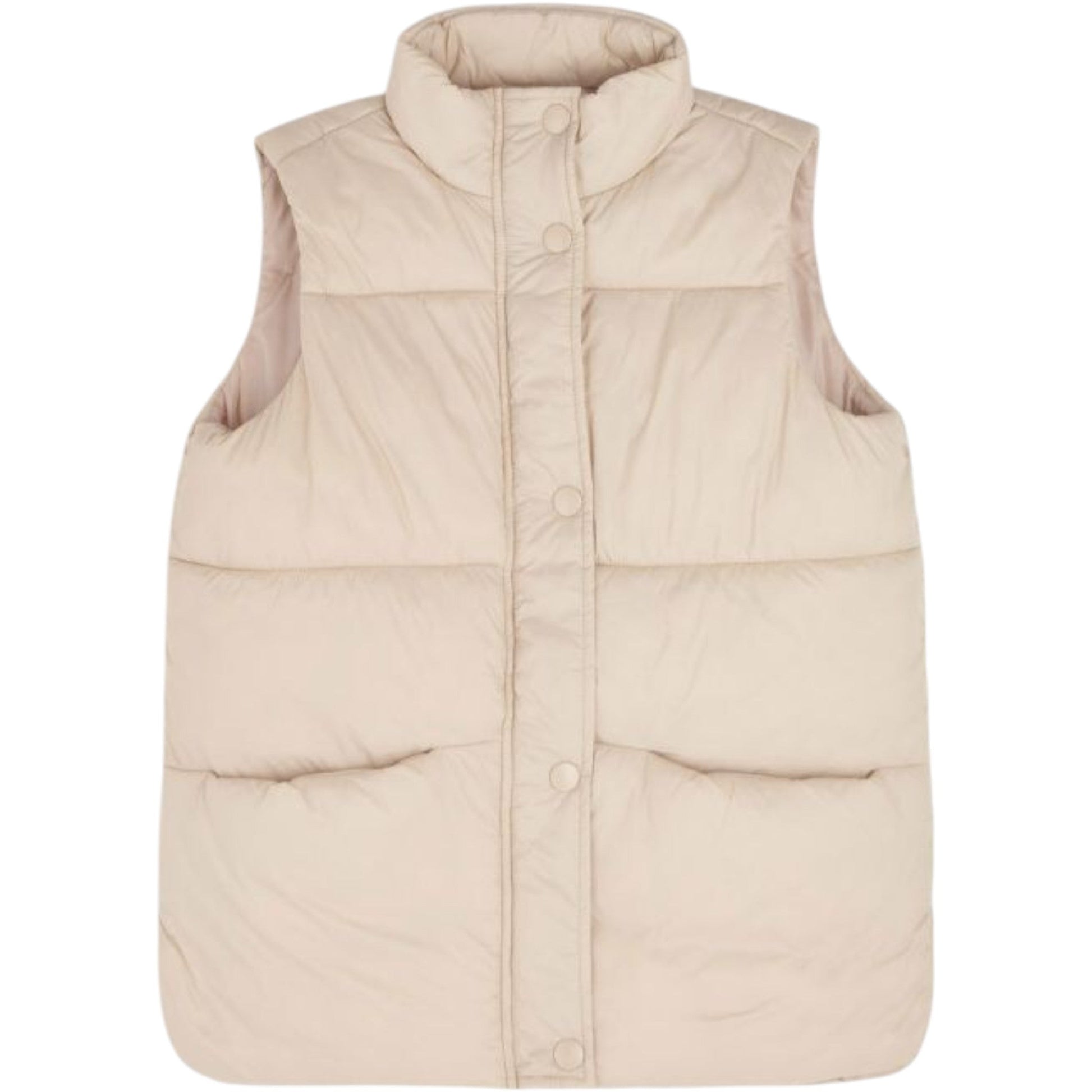 Címke nélküli, bézs, állógalléros, steppelt mellény. Patenttal záródik, elől foltzsebekkel, vastag, puffer fazon.