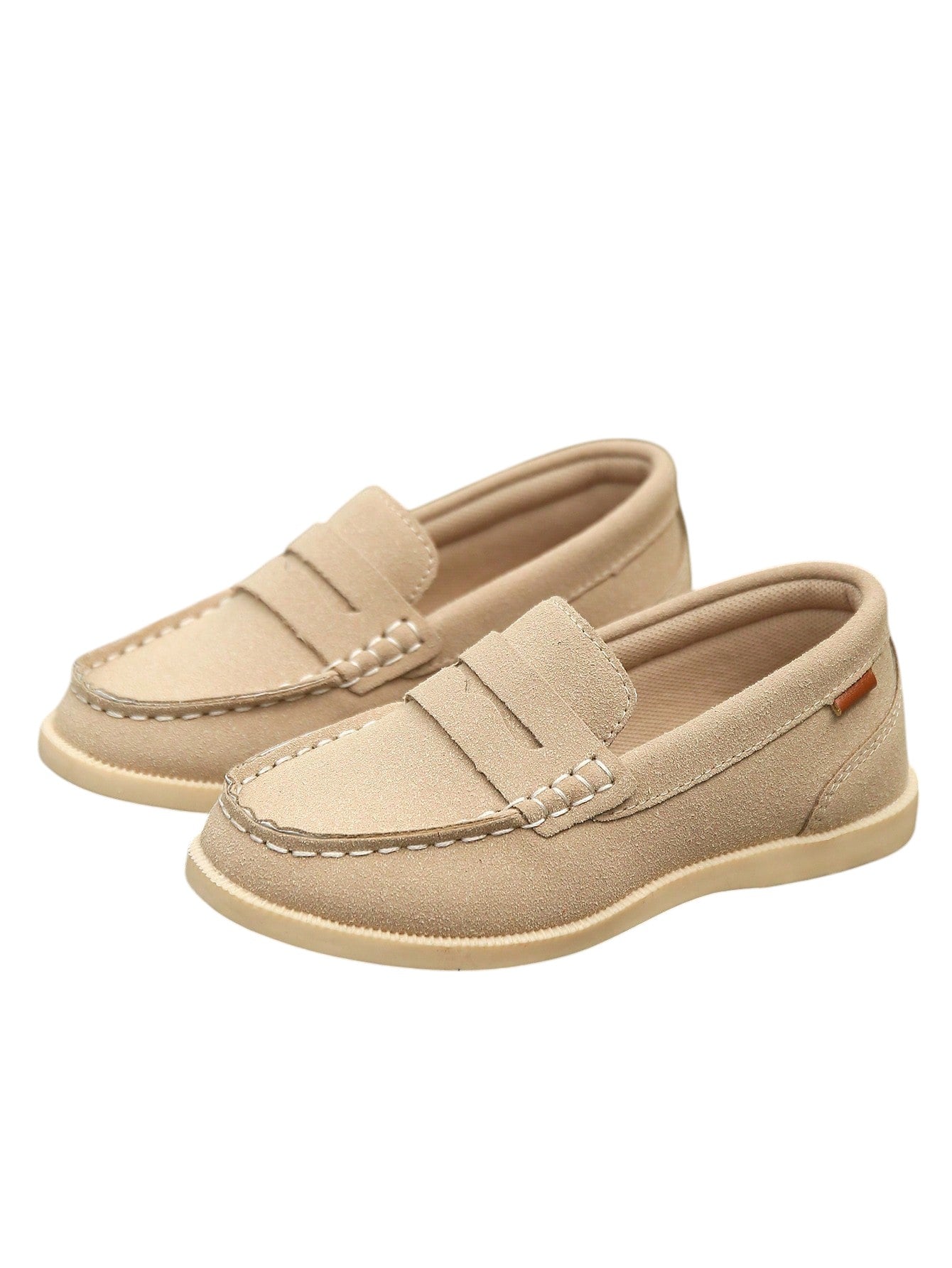 Címke nélküli, bézs színű, bebújós fazonú, steppelt részletekkel díszített cipő kisfiúnak