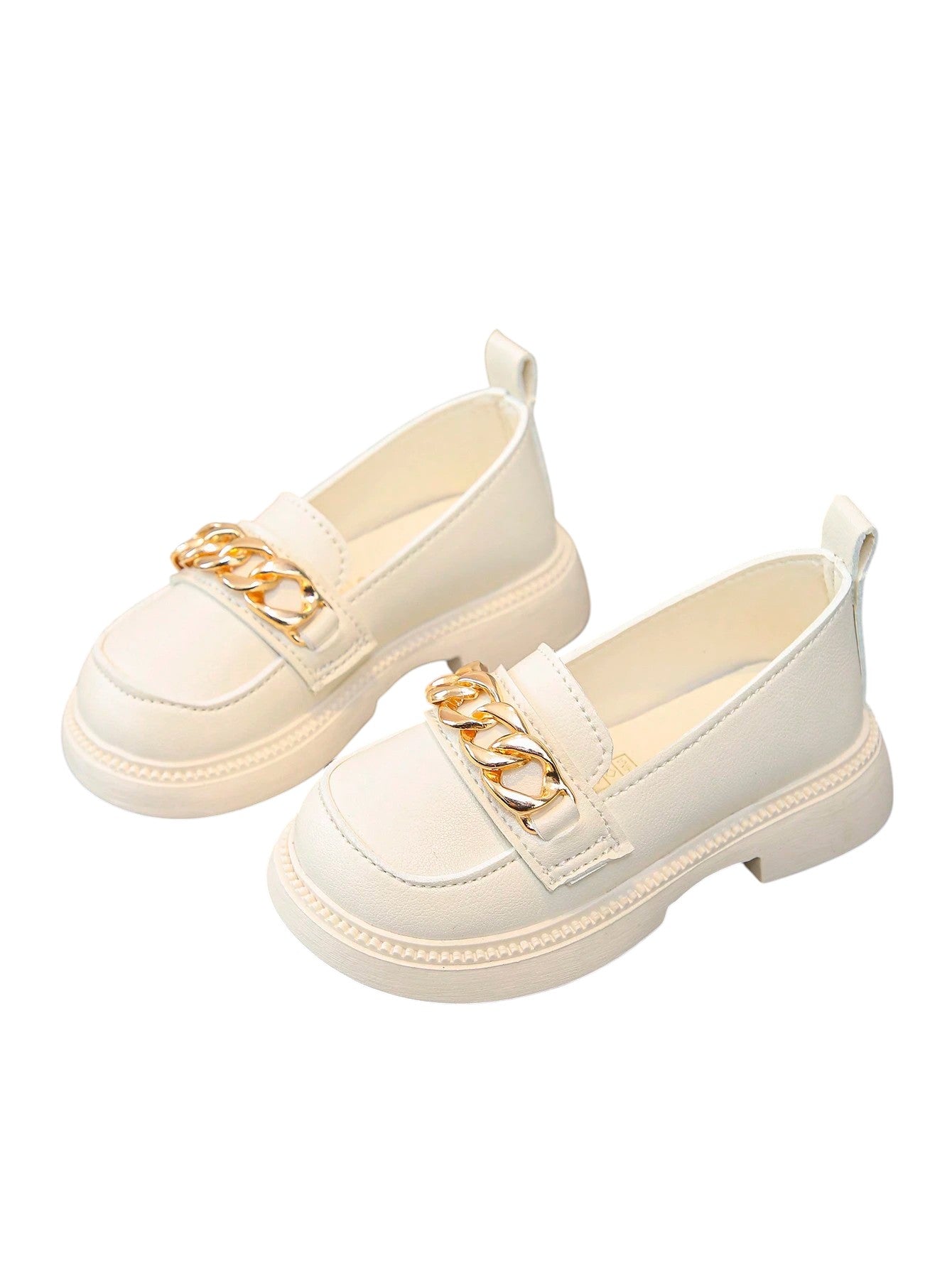 Címke nélküli, törtfehér, kerek orrú, vastag talpú loafer cipő arany színű lánccal