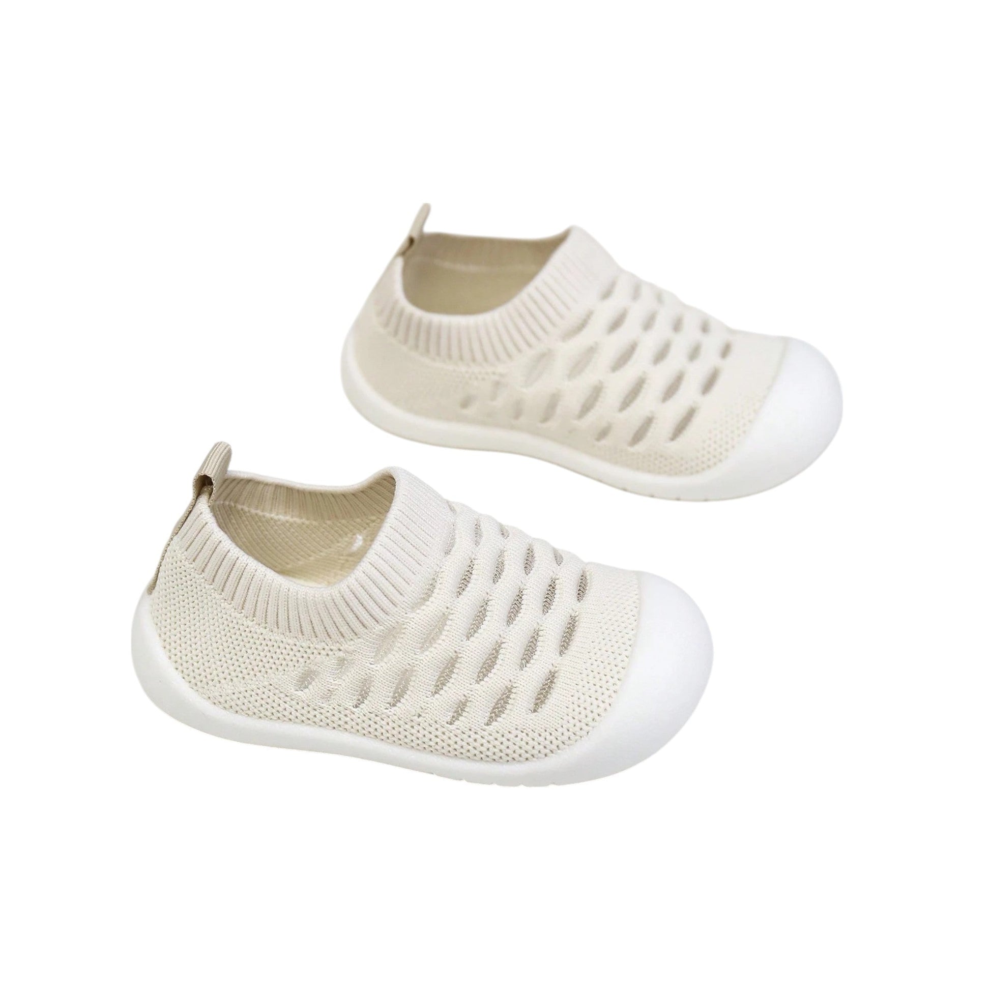 Címke nélküli, bézs színű, kötött, bebújós cipő, fehér talppal. Belső talp hossz: 12,5cm