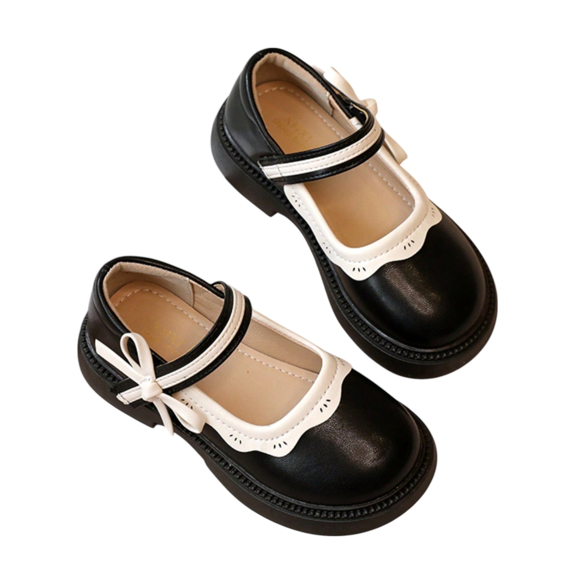 Címke nélküli, fekete és fehér színű, kerek orrú, pántos alkalmi cipő, fehér színű fodorral és masnival.